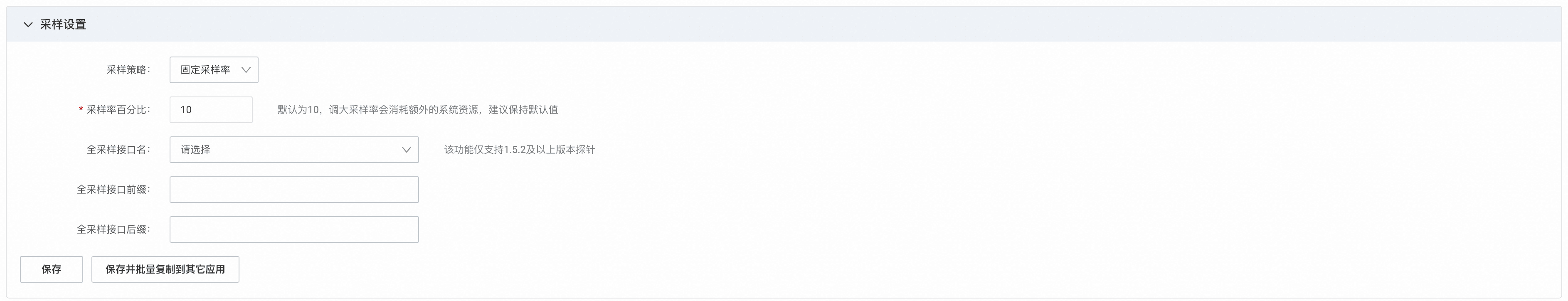 针对一些重要的接口如果需要全采样,可以通过应用设置-采样设置配置接口名称,也可以通过前缀、后缀匹配来配置,这样这个接口的请求都会被采样到,避免被丢掉。