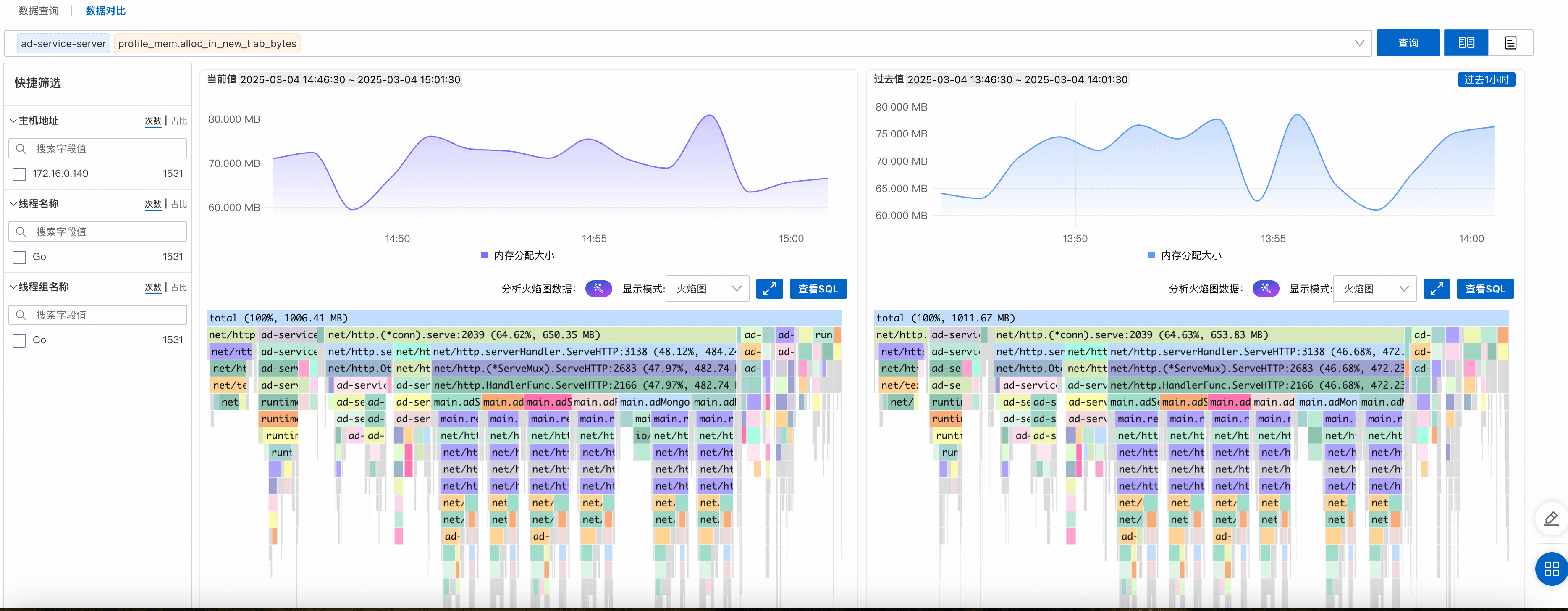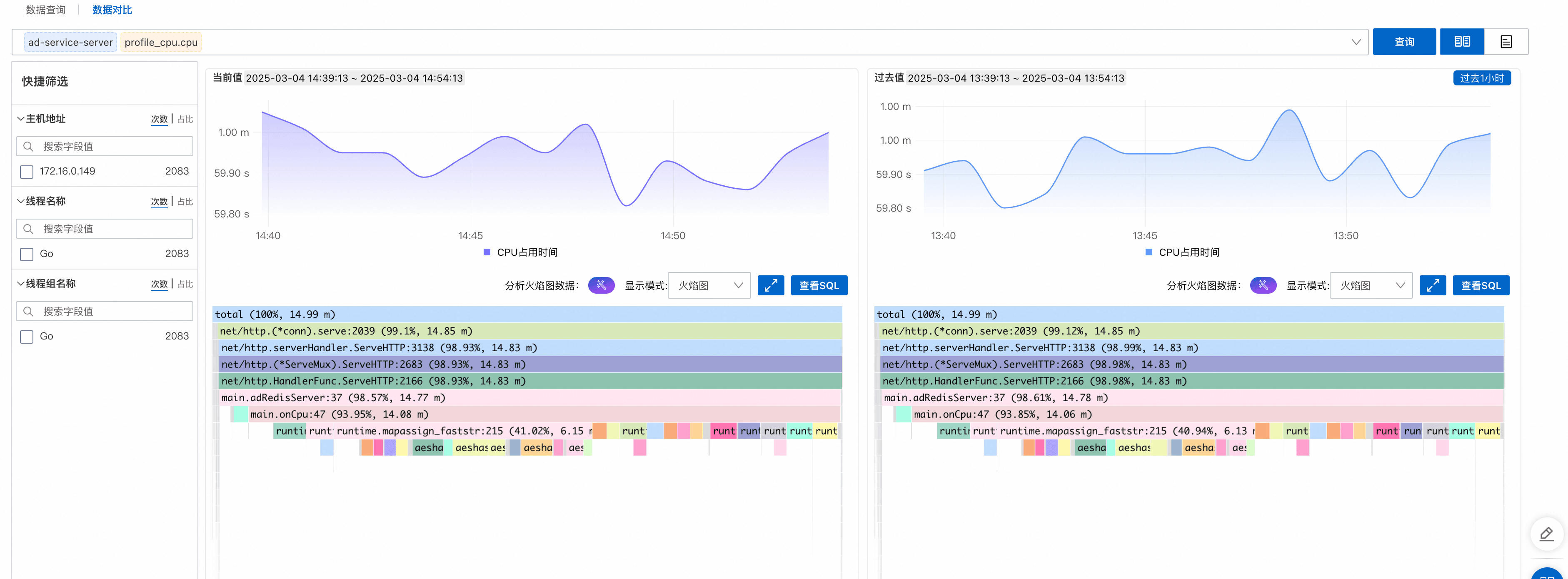 除了每分钟的数据之外,还提供了CPU Profiling数据的对比功能,对比前后CPU的消耗的不同,确定性能瓶颈。