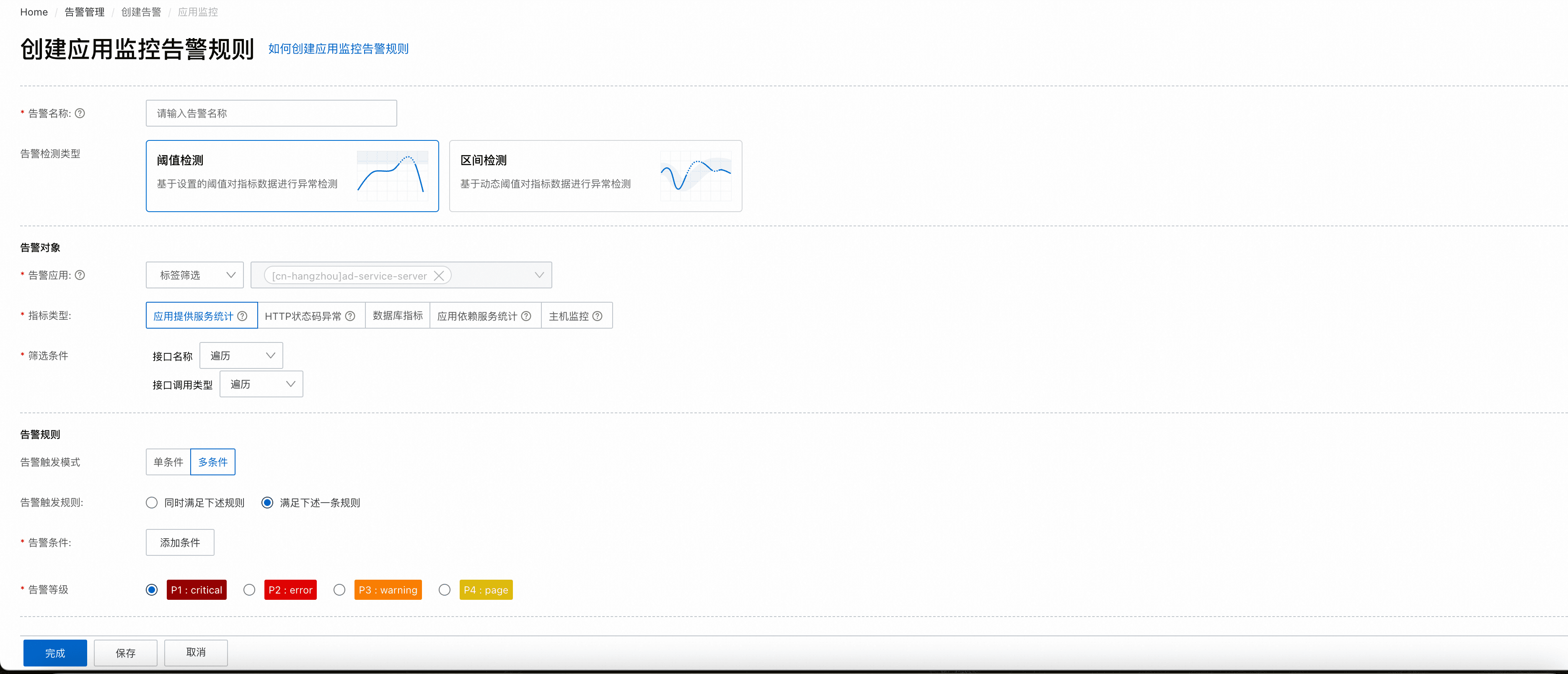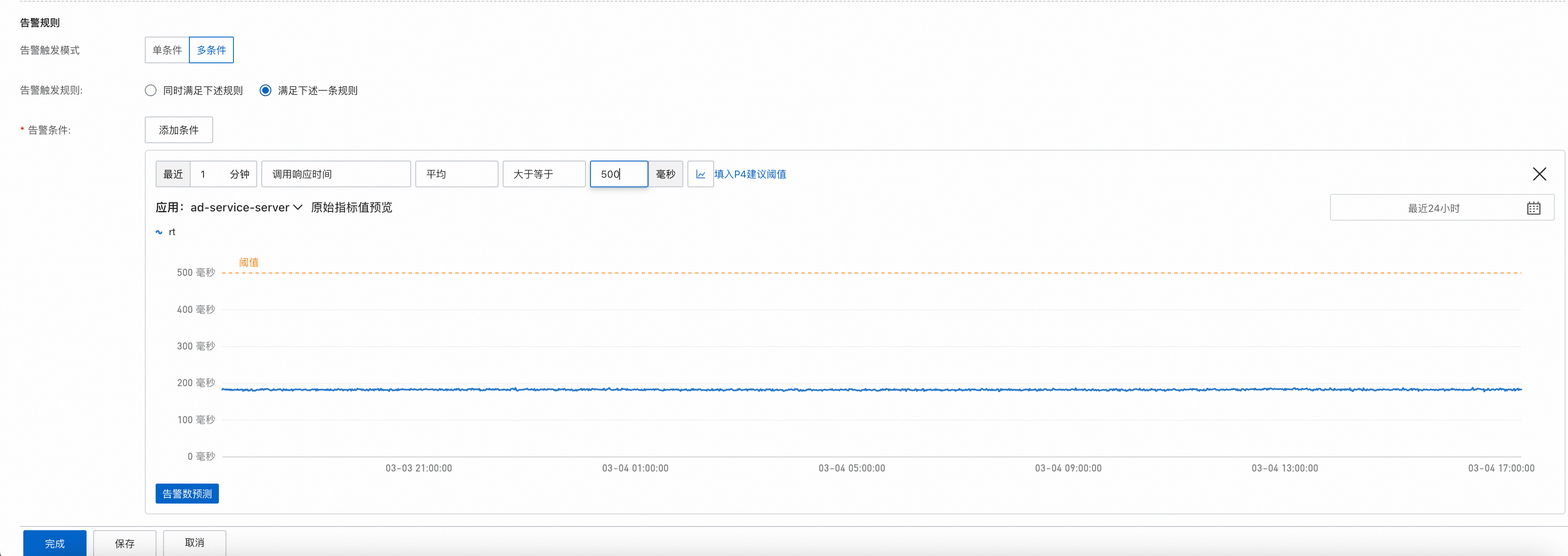 可以创建对应的告警,如最近1分钟调用响应时间大于等于500ms就报警。