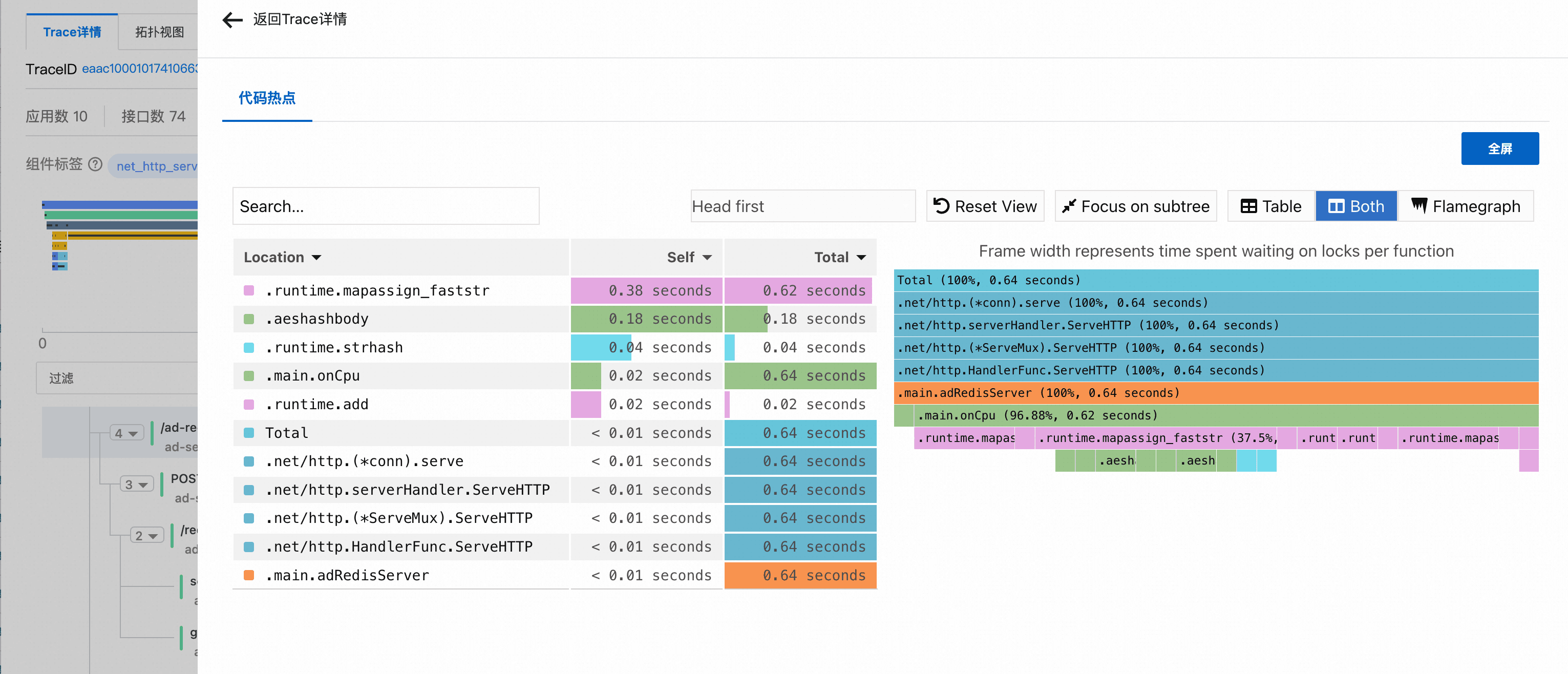 在出现应用请求超时、响应慢的时候,为了快速定位到性能问题,从提供服务找到出现响应慢的接口,跳转到调用链,从调用链分析看出来对应接口在某些请求中响应的时间超出正常值很多,这时候如果还要进一步定位到这个请求执行过程中响应慢的函数是哪个,则无法通过单纯的调用链分析获取到,代码热点就是用来解决这个问题。点开对应的Trace,通过放大镜即可查看当前的调用Profiling[2]: