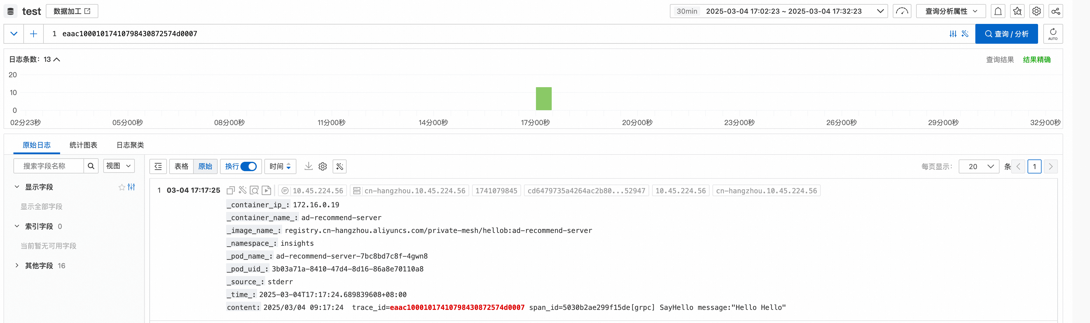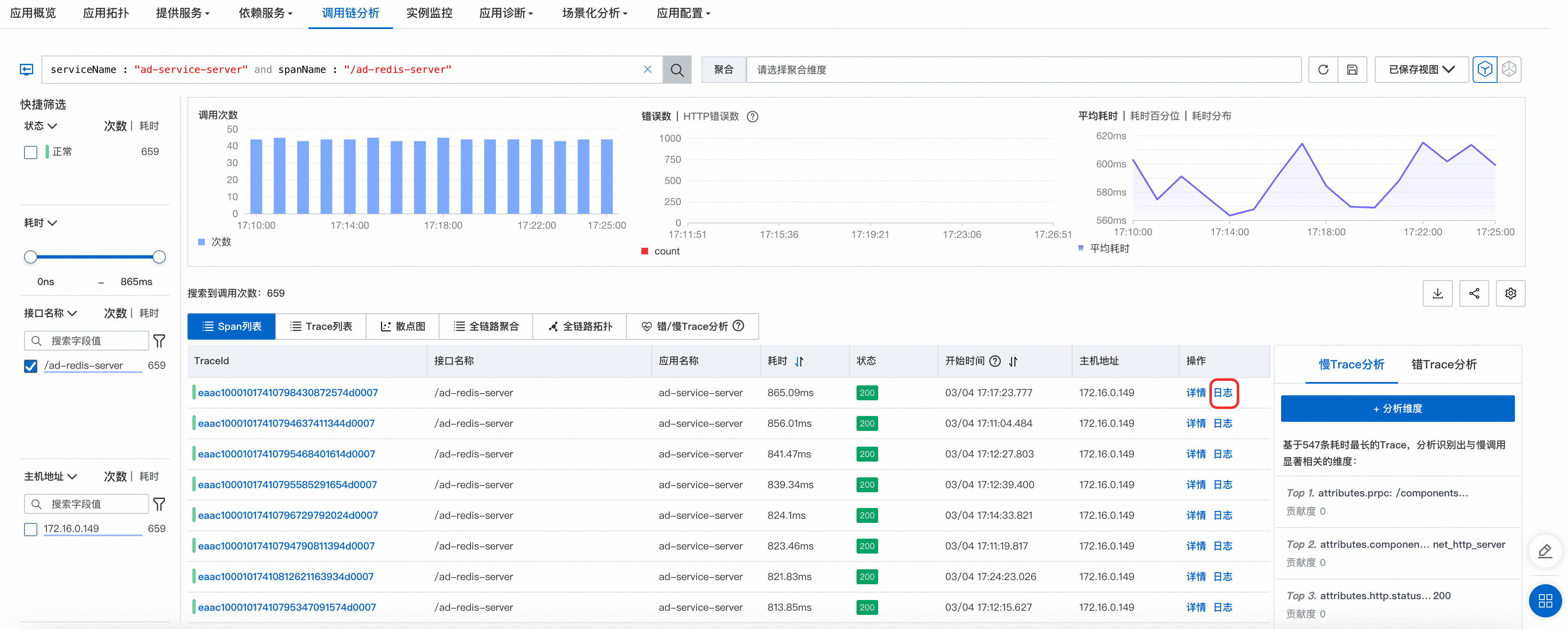 通过自定义插件打印了日志,或者通过已有代码的日志也可以进行快速查看问题,我们提供了TraceID和SpanID关联到日志的能力[4]。