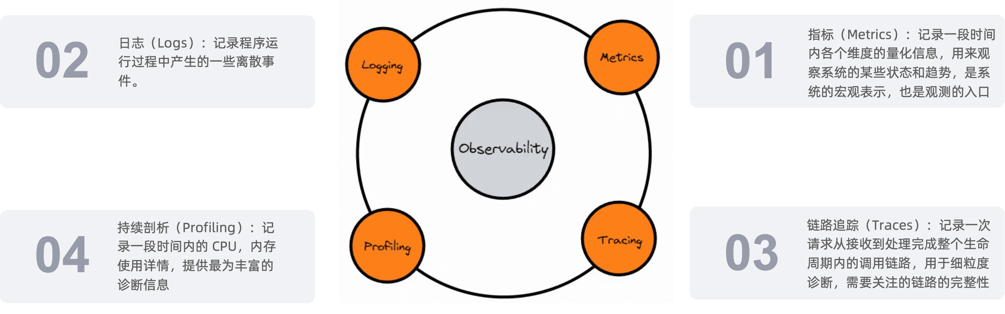 通过上述应用详情找到了请求慢的接口后,如何确认这时候的问题呢,我们可以通过应用诊断来发现问题,在应用监控中除了指标、链路、日志外,Profiling的数据成为了应用监控的四大支柱之一。