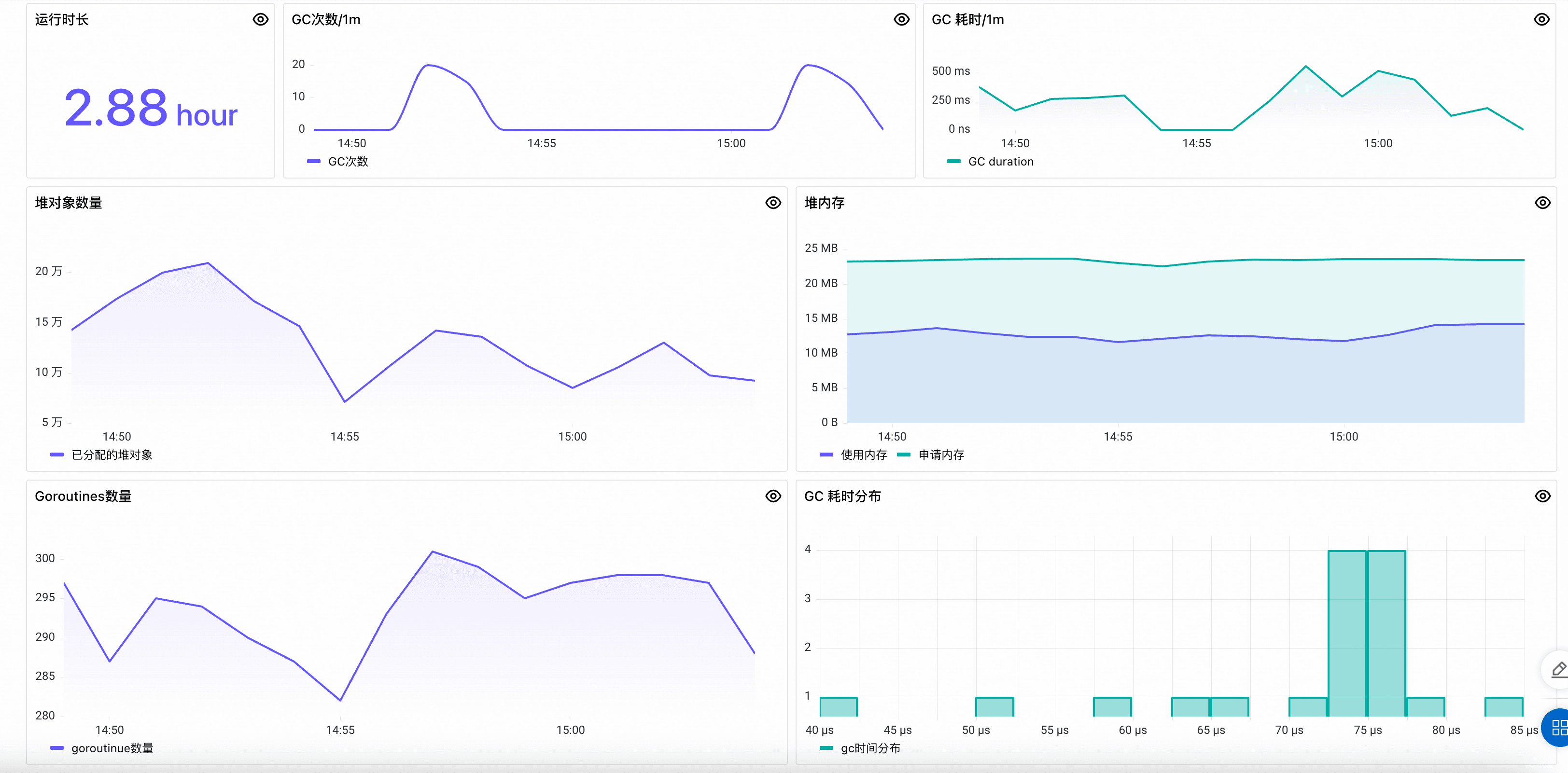 除了通过内存Profiling找到内存分配热点外,还可以通过Runtime监控,找到每个时刻Goroutines数量、以及堆对象的数量来看某个时刻是否异常,是否因为流量突增导致的数量增加。