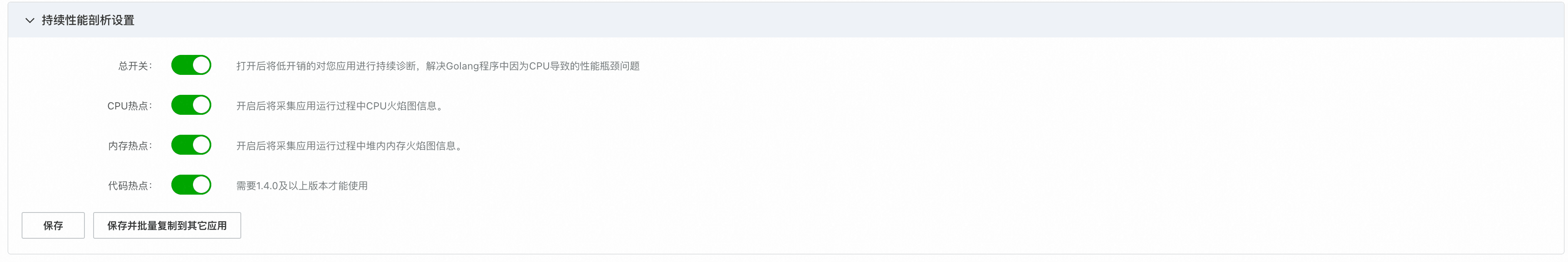 ARMS的持续剖析能力跟通过类似https://github.com/grafana/pyroscope或者go提供的pprof等工具相比,ARMS提供的Profiling能力可以做到随开随关,通过应用设置-持续性能剖析设置即可进行开关设置,无需重启,直接生效。