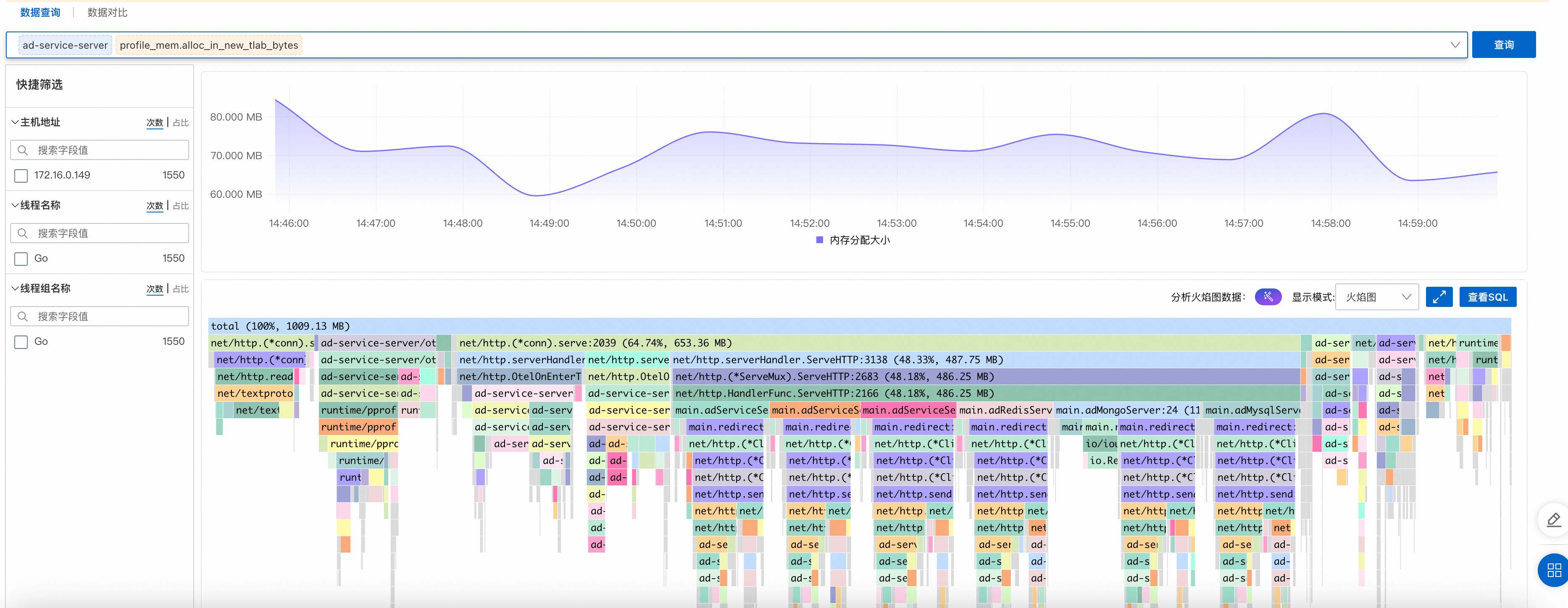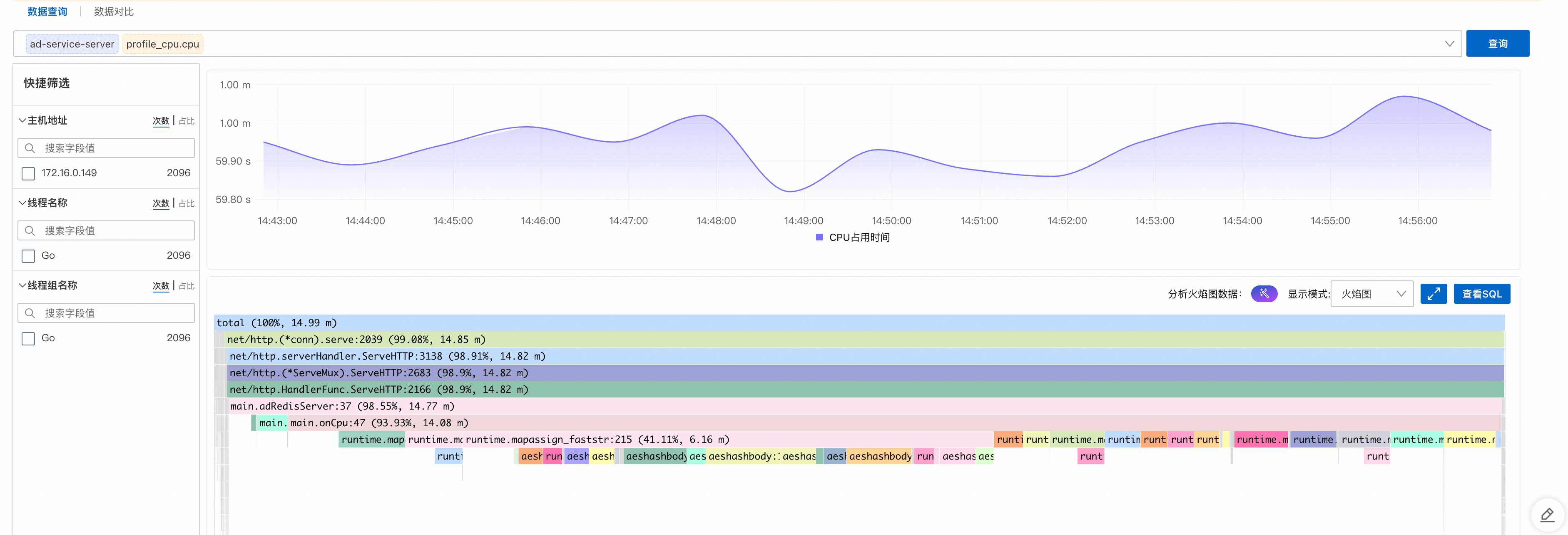 CPU Profiling用于收集和分析 Go 应用程序中的 CPU 使用情况,了解你的程序在运行时有多少时间花费在各个函数上。通过分析这些数据,开发者可以识别出程序中最耗费 CPU 时间的部分,ARMS提供的CPU Profiling数据会采集每分钟的CPU 运行情况,通过下面的火焰图即可找到当前执行时间最长的函数。