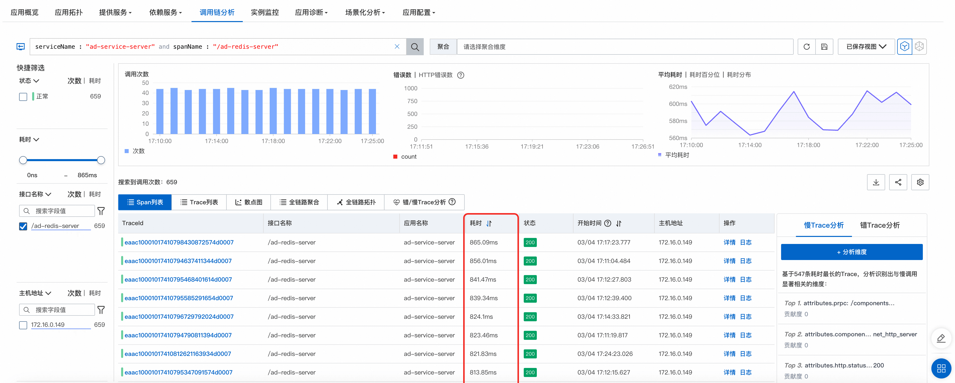 查看对应的调用链,可以按耗时排列,找到耗时最长的调用链: