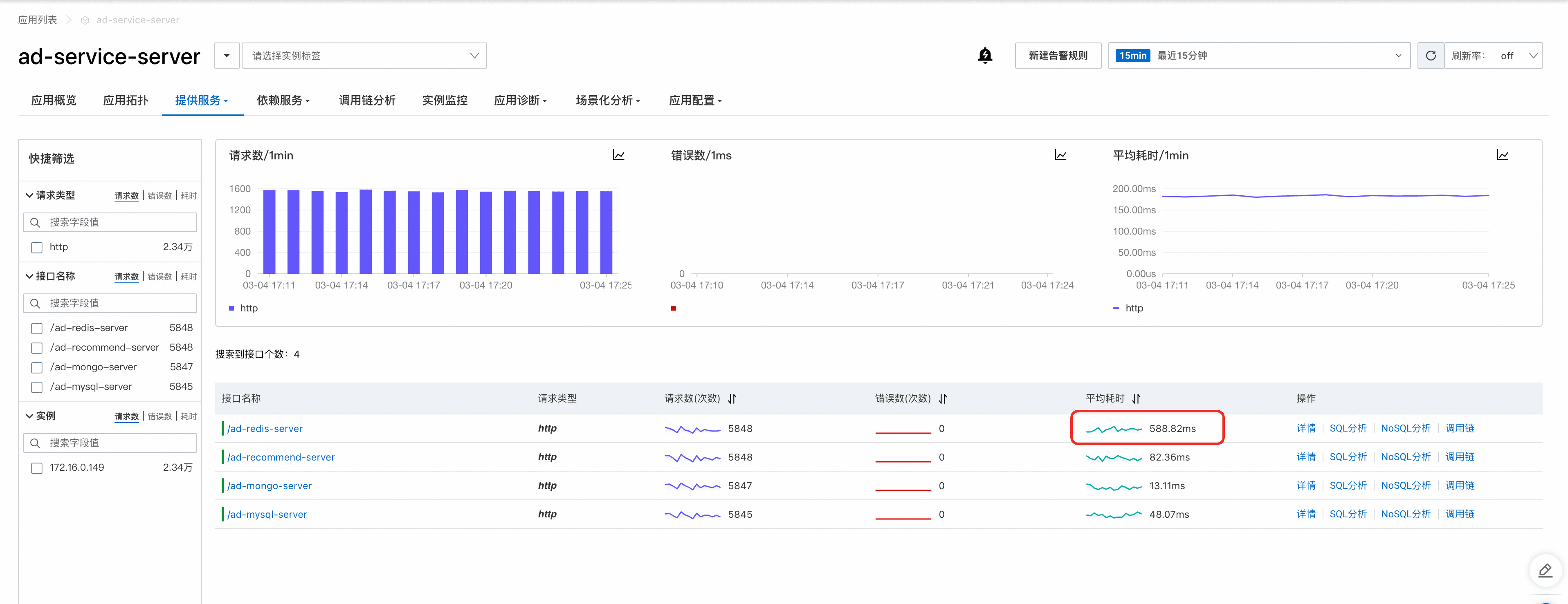 通过监控告警第一时间发现问题后,到对应服务的详情查看这个接口的平均耗时非常长,即知道了告警是由于这个接口导致的。
