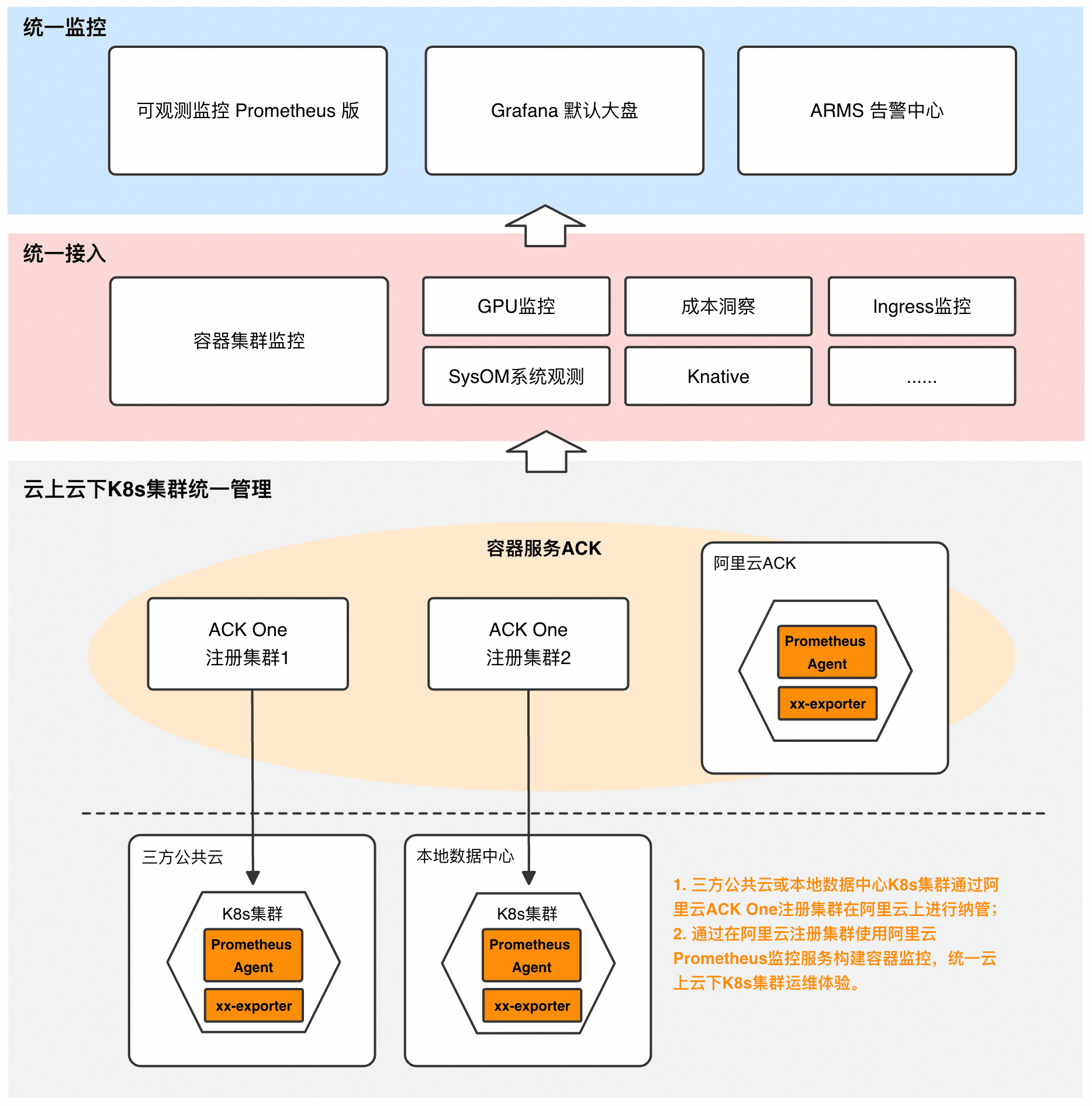 每个集群的监控系统独立升级和维护,不仅操作重复,而且新功能或补丁的部署难以做到统一和增加了技术债务。同时云上云下集群采集组件管控、升级方式不统一,会额外增加维护成本。