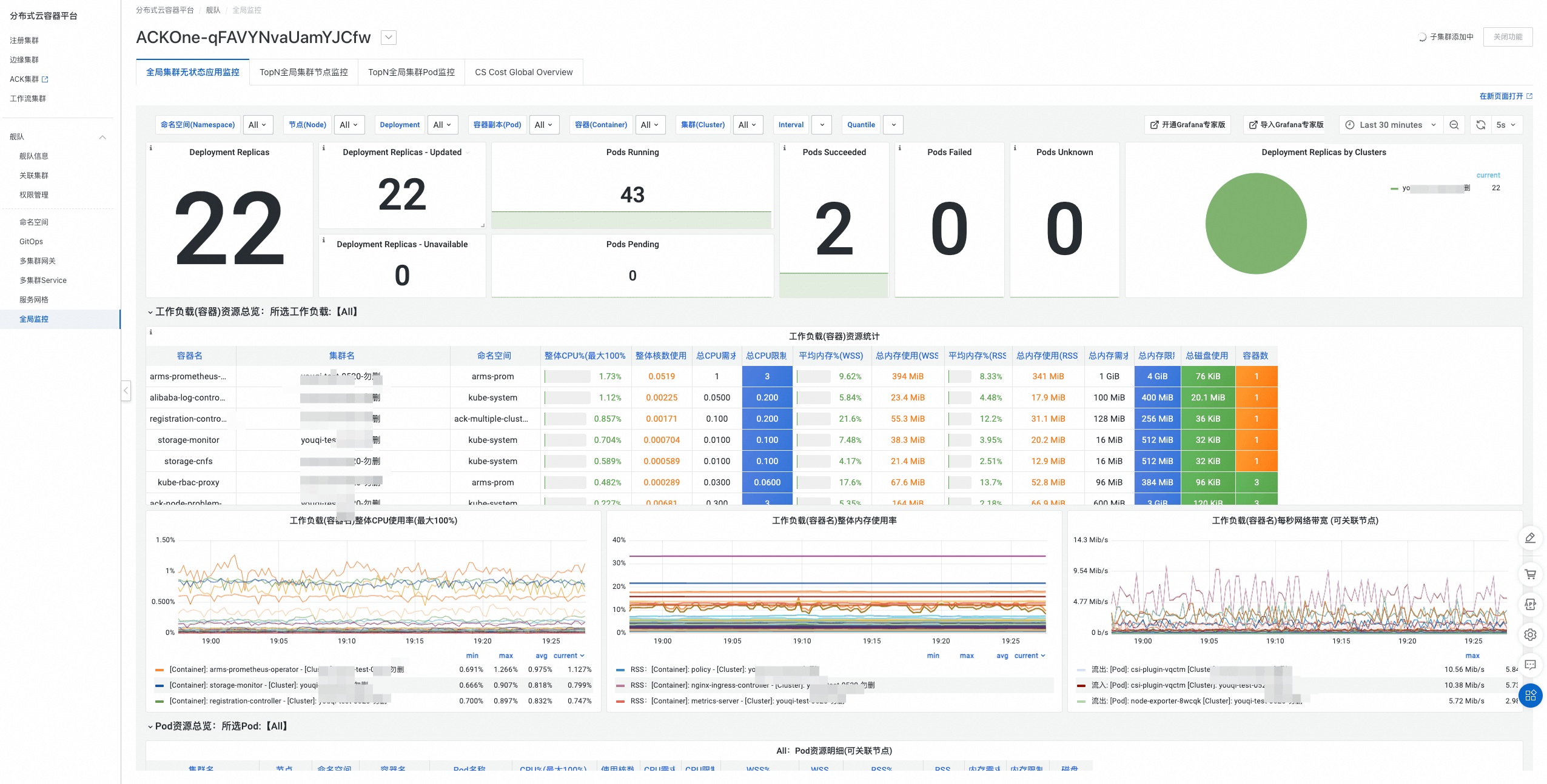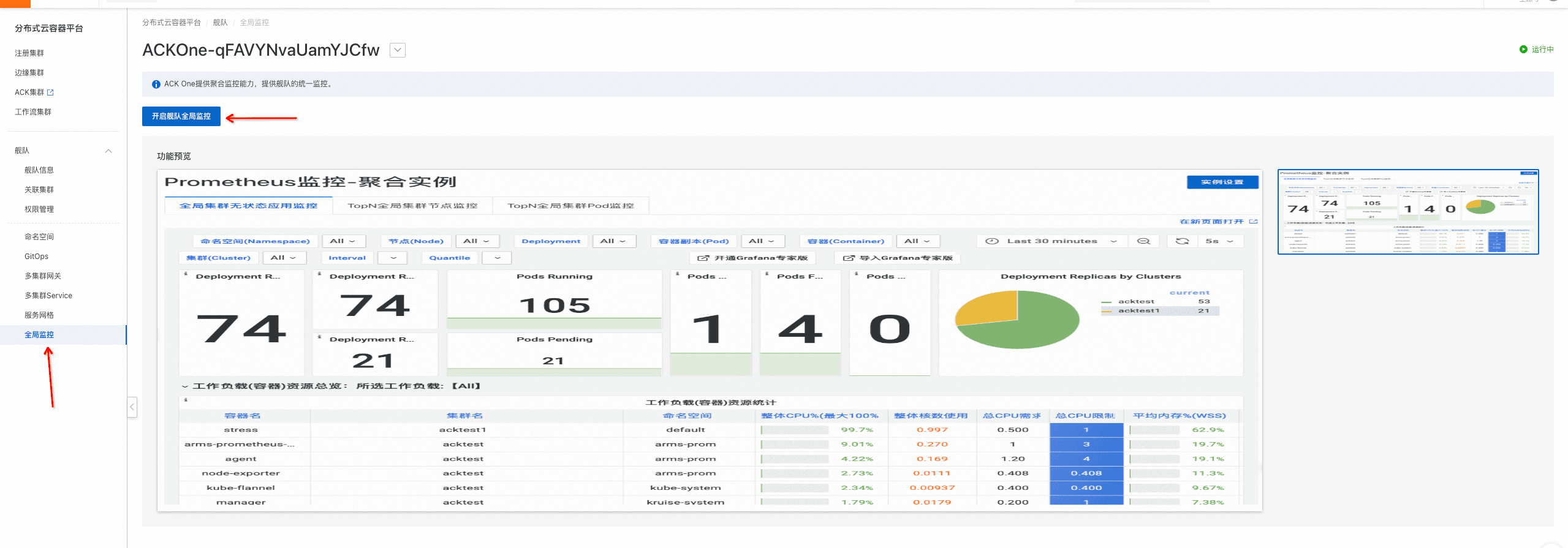 阿里云ACK One集成了可观测监控Prometheus版,支持用户一键开启全局统一监控。当您同时运行着来自不同供应商、不同地域的多个K8s集群时,您可以通过多集群舰队ACK One Fleet关联多个集群,达成统一监控的效果。