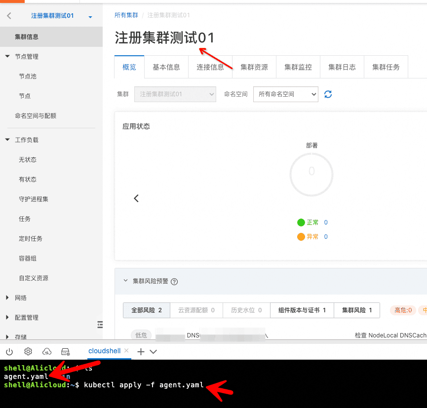 - 目标集群“注册集群测试01”中可以查看下代理的运行状态。