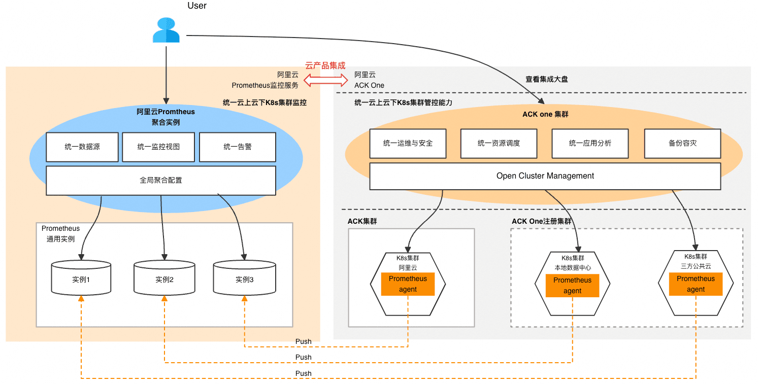 在当今数字化转型加速的时代,随着混合云、多云多集群环境等技术被众多企业广泛应用,分布式云架构已成为众多企业和组织推动业务创新、实现弹性扩展的首选,**分布式云容器平台ACK One(Distributed Cloud Container Platform for Kubernetes)是阿里云面向混合云、多集群、分布式计算等场景推出的企业级云原生平台,助力用户对任何地域、任何集群进行统一运维管控。**那么在日益复杂、环境异构的基础设施中,如何有效的统一监控横跨云上云下、数量较多的 Kubernetes 集群,成为了运维团队面临的一大挑战。传统监控方案往往难以应对这种动态变化、高度分布式的环境,**阿里云可观测监控Prometheus版使用全局聚合实例,构建一套灵活、统一的可视化监控视图,并集成到分布式云容器平台ACK One集群中,为用户提供开箱即用的多集群统一监控能力。**本文主要介绍在该场景下如何实现分布式云多集群的统一监控方案。
