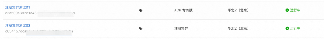 **步骤一:准备环境。**在阿里云容器服务控制台创建注册集群,本文使用如下两个已创建集群,其中“注册集群测试01”可以类比您本地数据中心或三方云K8s集群,“注册集群测试02”是阿里云注册集群。以此模拟将目标集群“注册集群测试01”纳管到“注册集群测试02”中的流程。