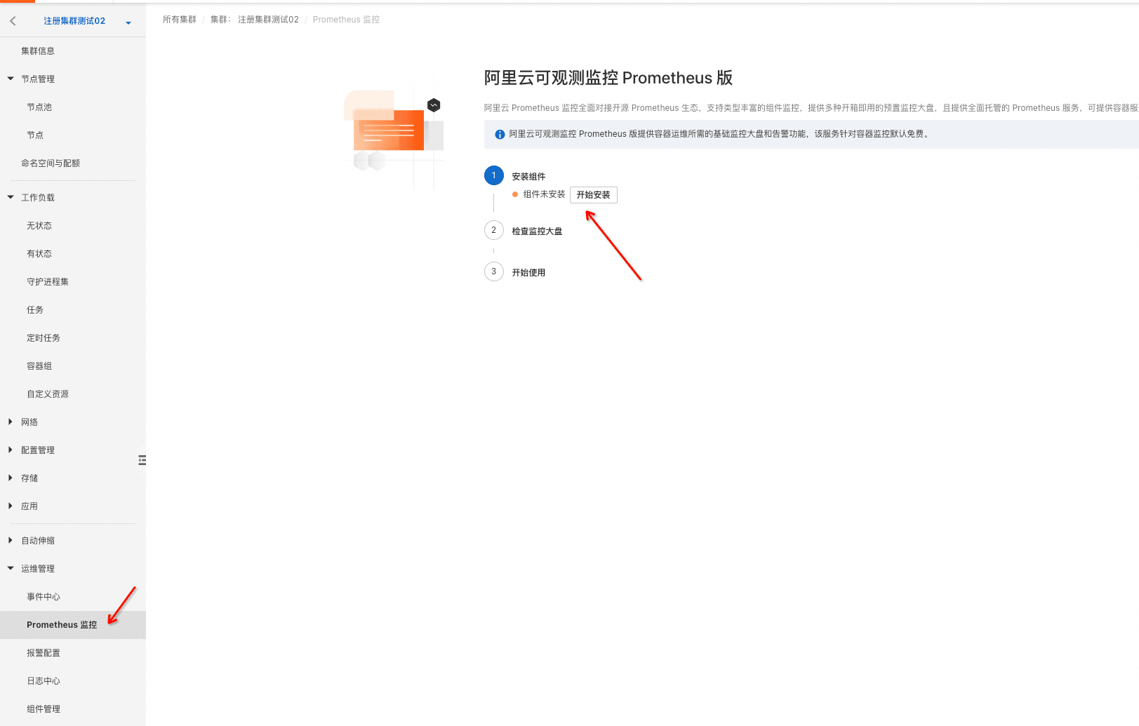 - 开启监控:在纳管完成后,类似其他ACK集群类型,可以在注册集群中安装阿里云Prometheus组件,开启容器监控。
