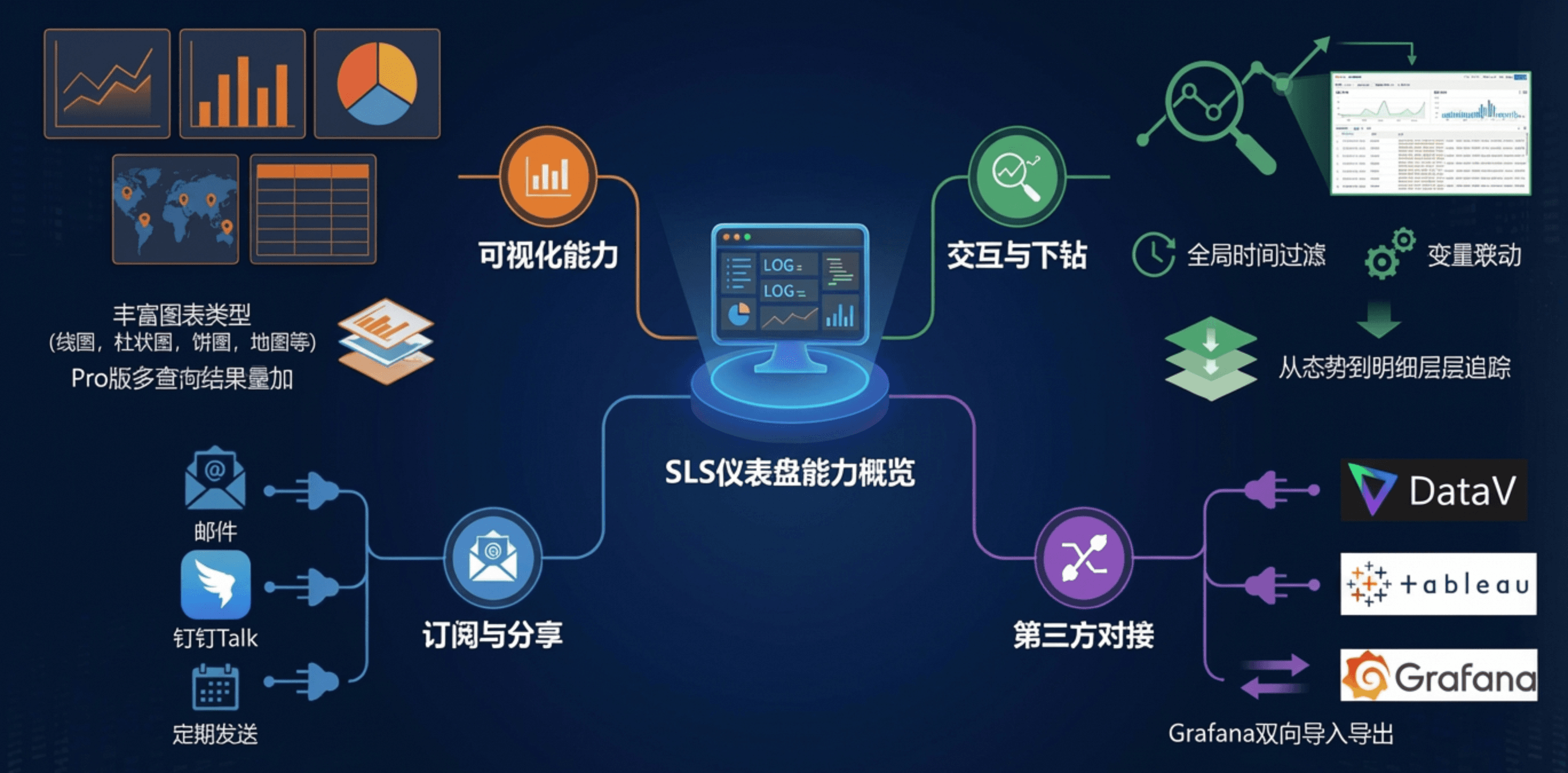 - 订阅与分享:支持定期将仪表盘渲染为图片,通过邮件或钉钉群发送;支持控制台内嵌到第三方系统。