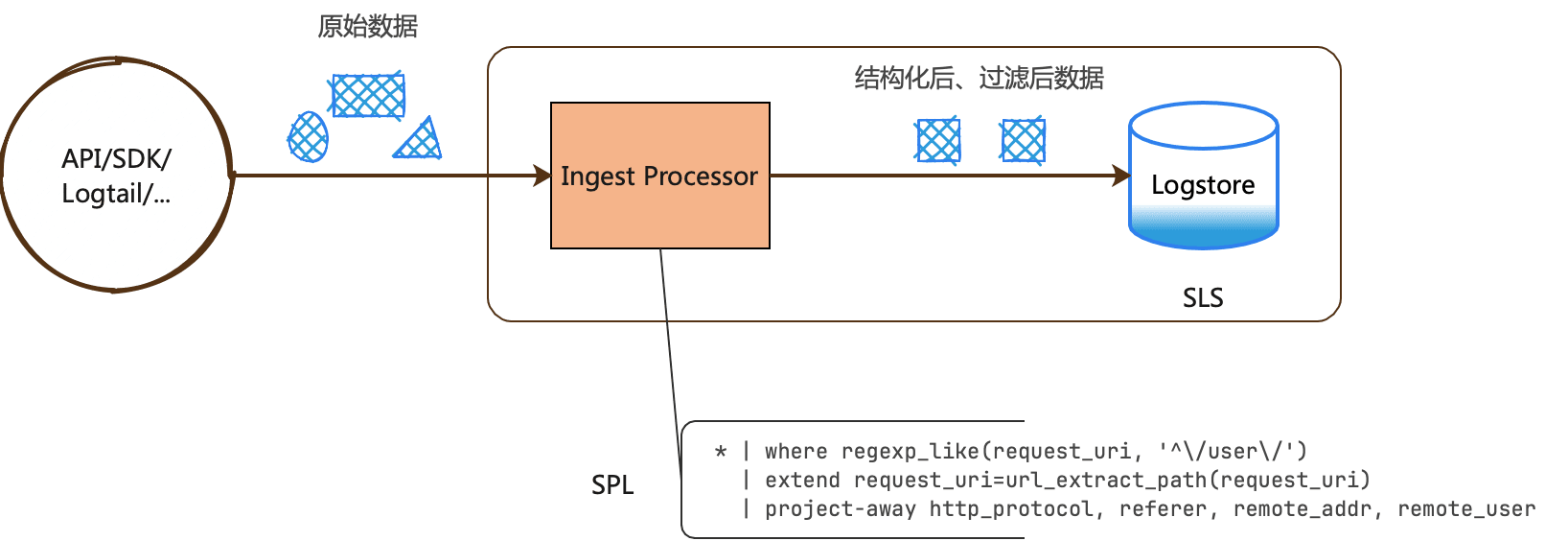数据写入 Logstore 前,可以使用写入处理器(IngestProcessor)在入库前对数据进行处理,例如数据过滤、字段提取、字段扩展、数据脱敏。如下图所示: