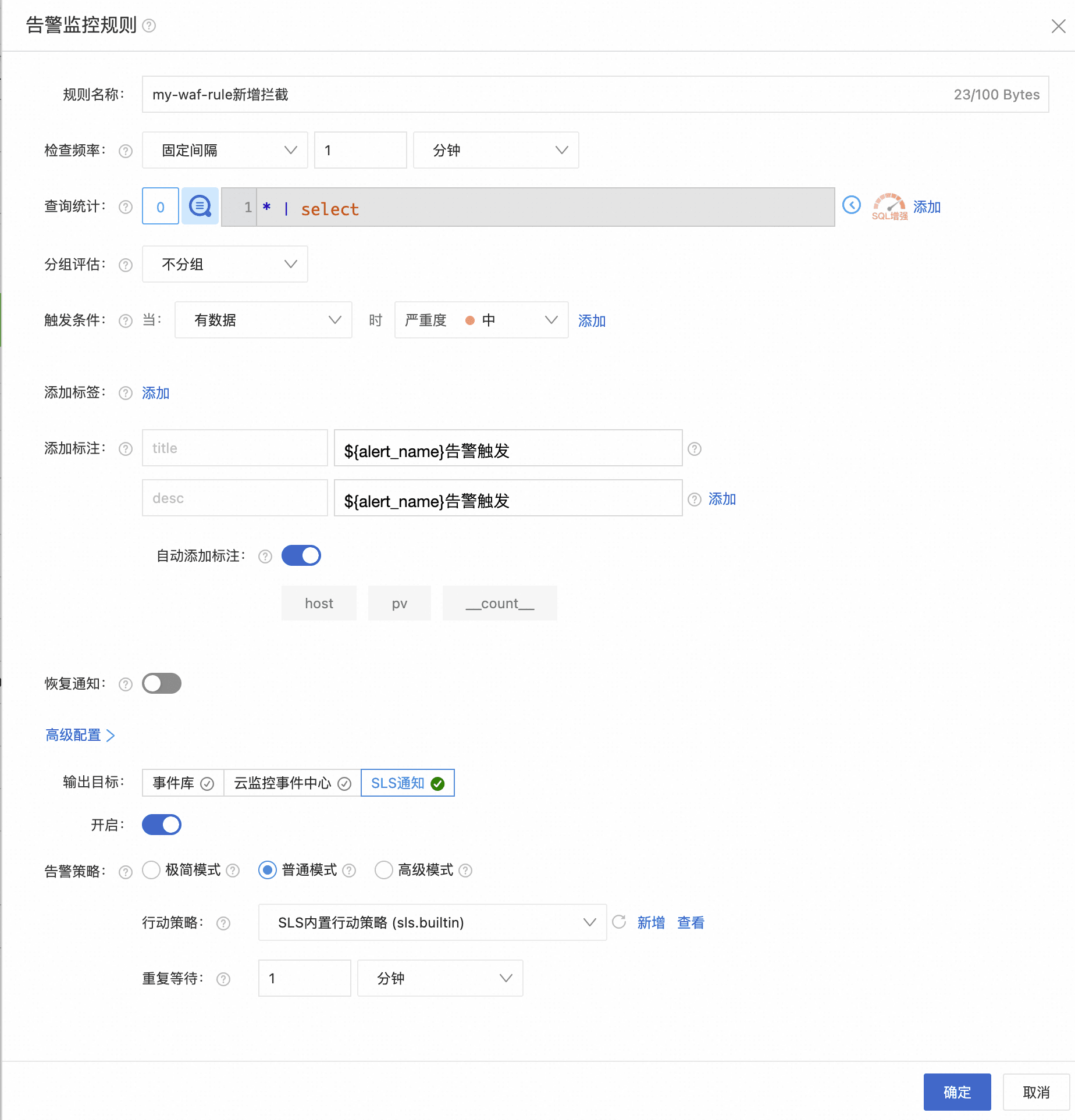 **告警 2:特定**保护包(web ACL)非终止规则**触发,监控** SQL 注入和跨站脚本攻击(XSS)