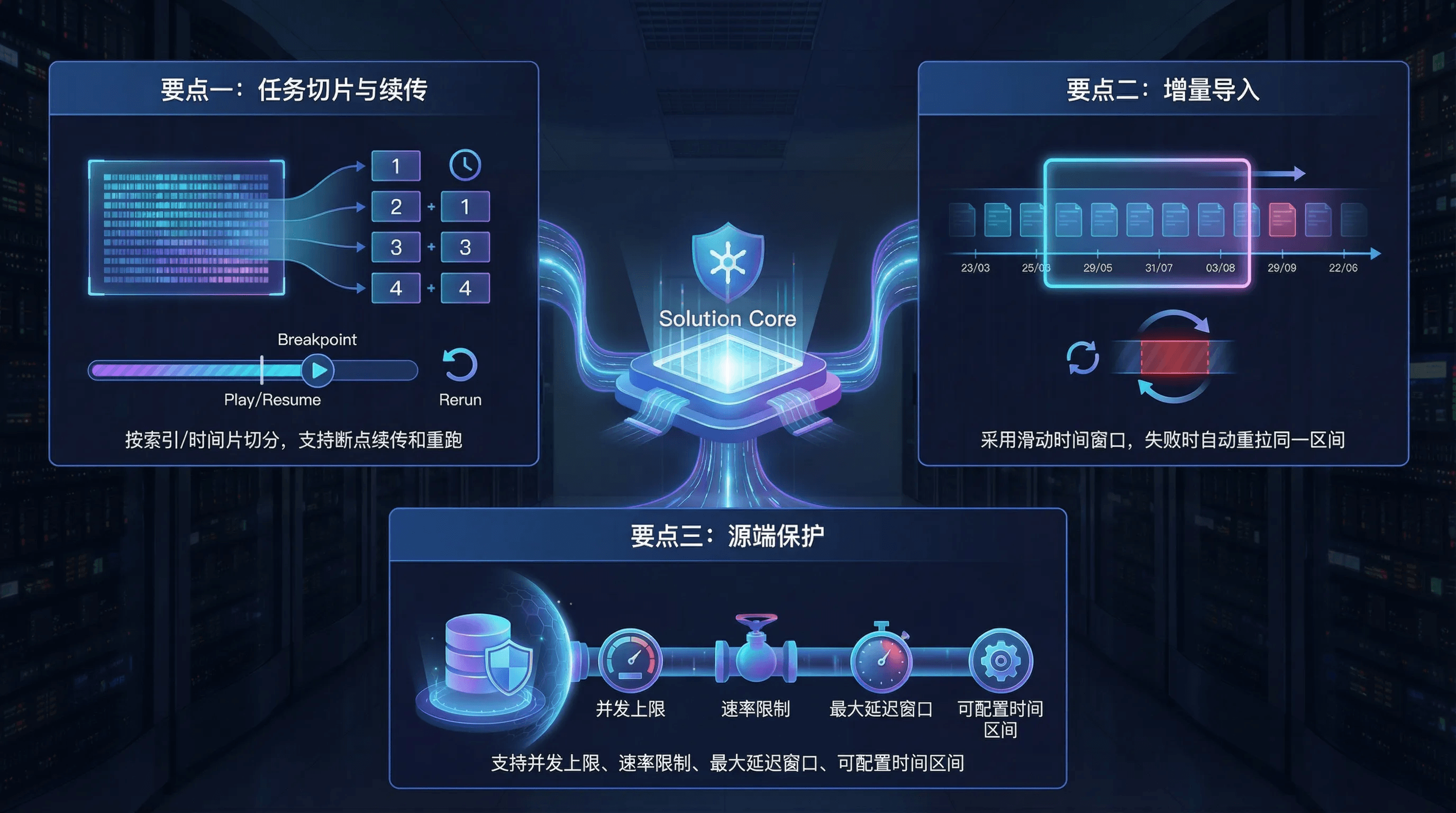 - 要点二:增量导入用“滑动时间窗口”推进,失败自动重拉同一时间区间