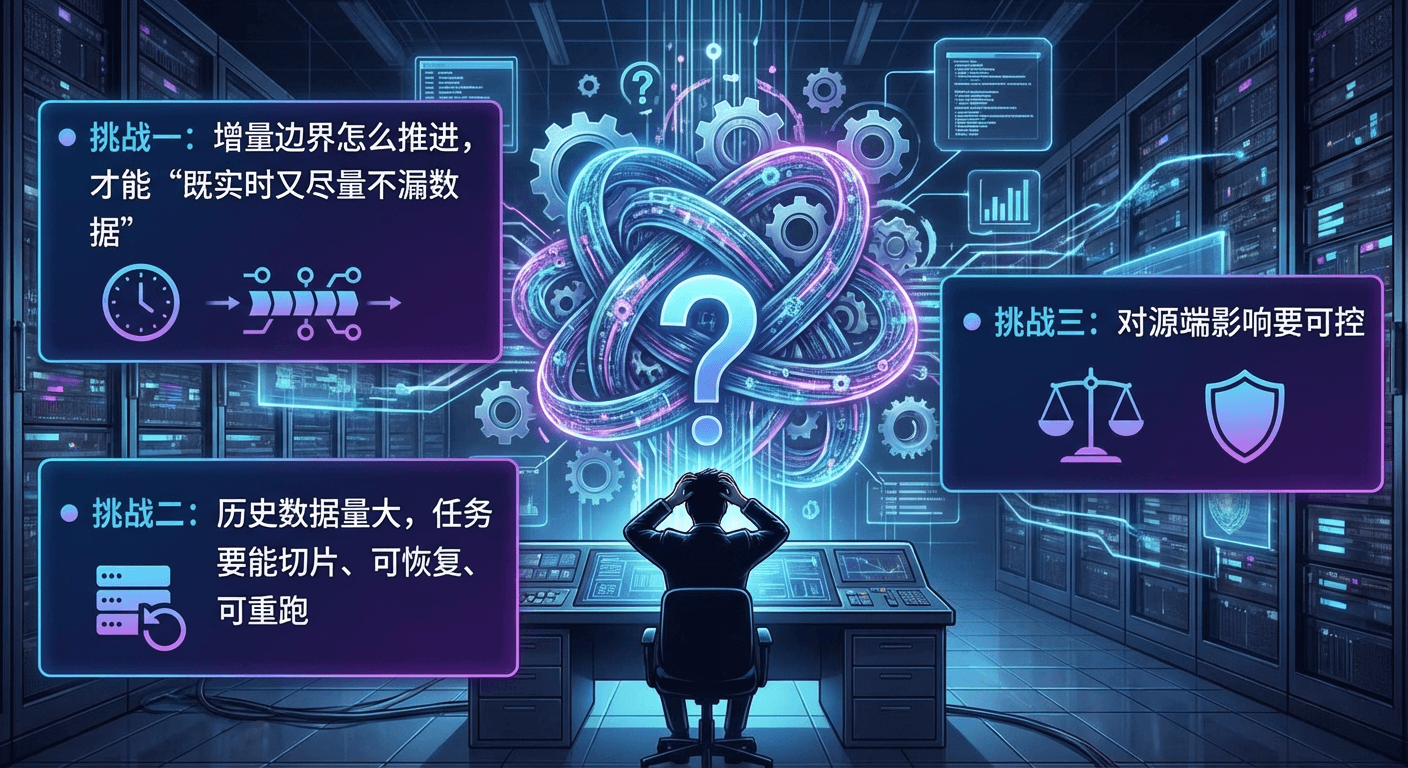 - 挑战二:历史数据量大,任务要能切片、可恢复、可重跑