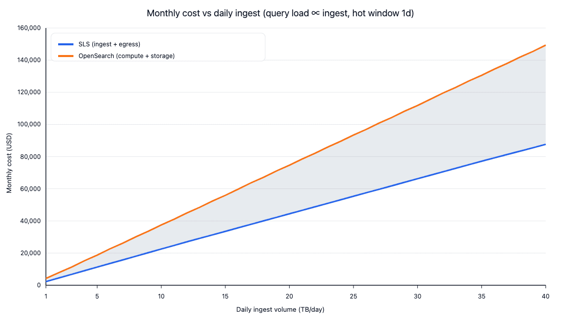 注:随着日写入量从 1–40 TB/天增加,SLS 的月度端到端成本始终低于 OpenSearch Serverless,且两者的绝对成本差额随数据量扩大
