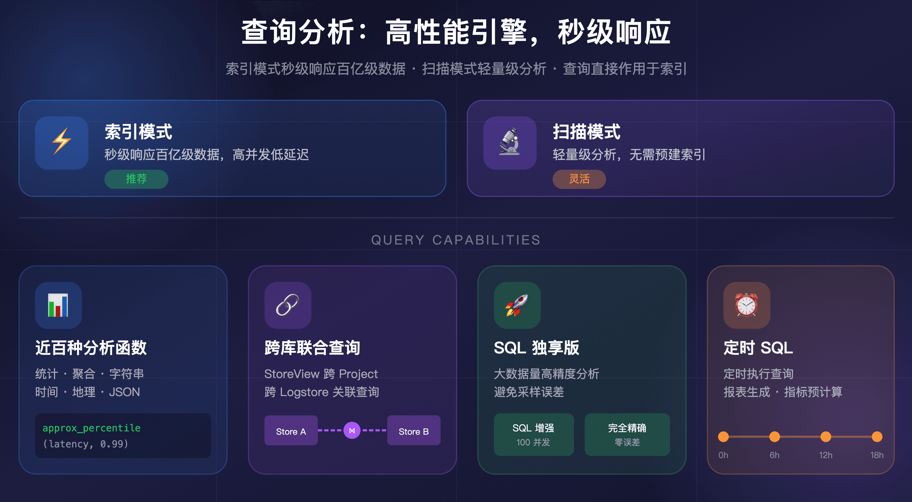SLS 提供高性能查询引擎,支持索引模式(秒级响应百亿级数据)与扫描模式(轻量级分析)。查询直接作用于索引,无需预建数据集或刷新延迟。针对超大规模数据分析场景,SLS 提供 SQL 独享版,包括 SQL 增强和 SQL 完全精确两种模式。