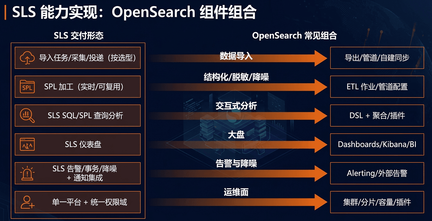 如果你选择 OpenSearch Serverless,可以把“集群/节点/分片”等运维显著简化。要实现与 SLS 类似的“导入 → 加工 → 查询 → 大盘 → 告警 → 处置/联动”闭环,可能需要使用以下 OpenSearch/AWS 已提供的托管能力进行组合: