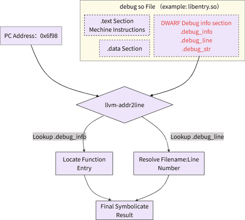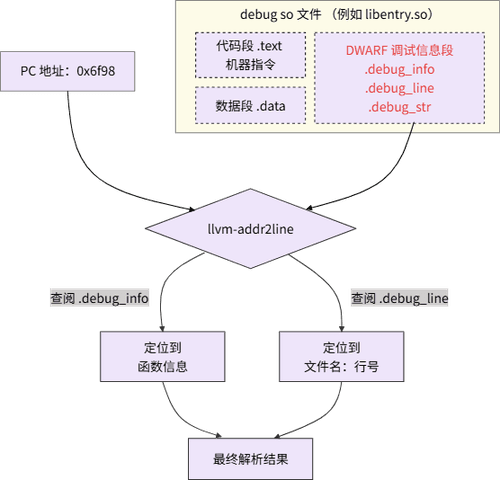 llvm-addr2line 是业内主流的 C++ 堆栈解析工具之一。现在我们深入 llvm-addr2line 内部,它的工作原理在鸿蒙场景下完全适用,核心依赖于编译产物 debug so 文件中包含的两样东西。