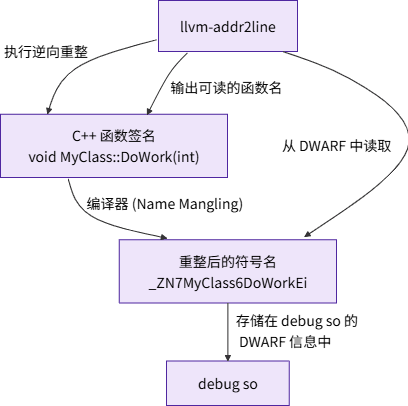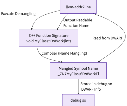 为了支持函数重载等 C++ 特性,编译器会把我们写的函数名(如 OH_NativeXComponent_RegisterCallback)转换成一个唯一的、但不可读的符号名(如 _Z35OH_NativeXComponent_RegisterCallbackP18OH_NativeXComponentP29OH_NativeXComponent_Callback)。这个过程叫名称重整 (Name Mangling)。llvm-addr2line 在 DWARF 信息中找到的就是这个重整后的符号名。为了方便开发者阅读,它会执行一个逆向过程——逆向重整 (Demangling),将其还原为原始的 C++ 函数签名。
