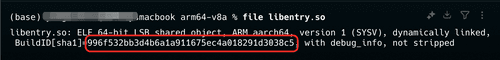其中,C++的调试产物 so 文件,可以通过 build ID 做到与异常堆栈的一一匹配。Build ID 是编译时生成的一个哈希值,唯一标识了 so 文件的一次特定构建,在解析时,需要保证 debug so 文件与当前堆栈所需要的 .so 文件是完全一致的版本,如果版本不匹配,解析出的行号和函数名将是错误的。以当前场景的编译产物与堆栈为例,可以在存放 so 文件的目录下,执行 file 命令获取当前 so 文件的 BuildID,如图所示。