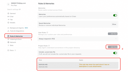 - 描述完整性检查:对于生效规则为 Agent Requested 的 Rule,强制要求其 description 字段不能为空且有意义,确保 AI 可以准确理解其用途;