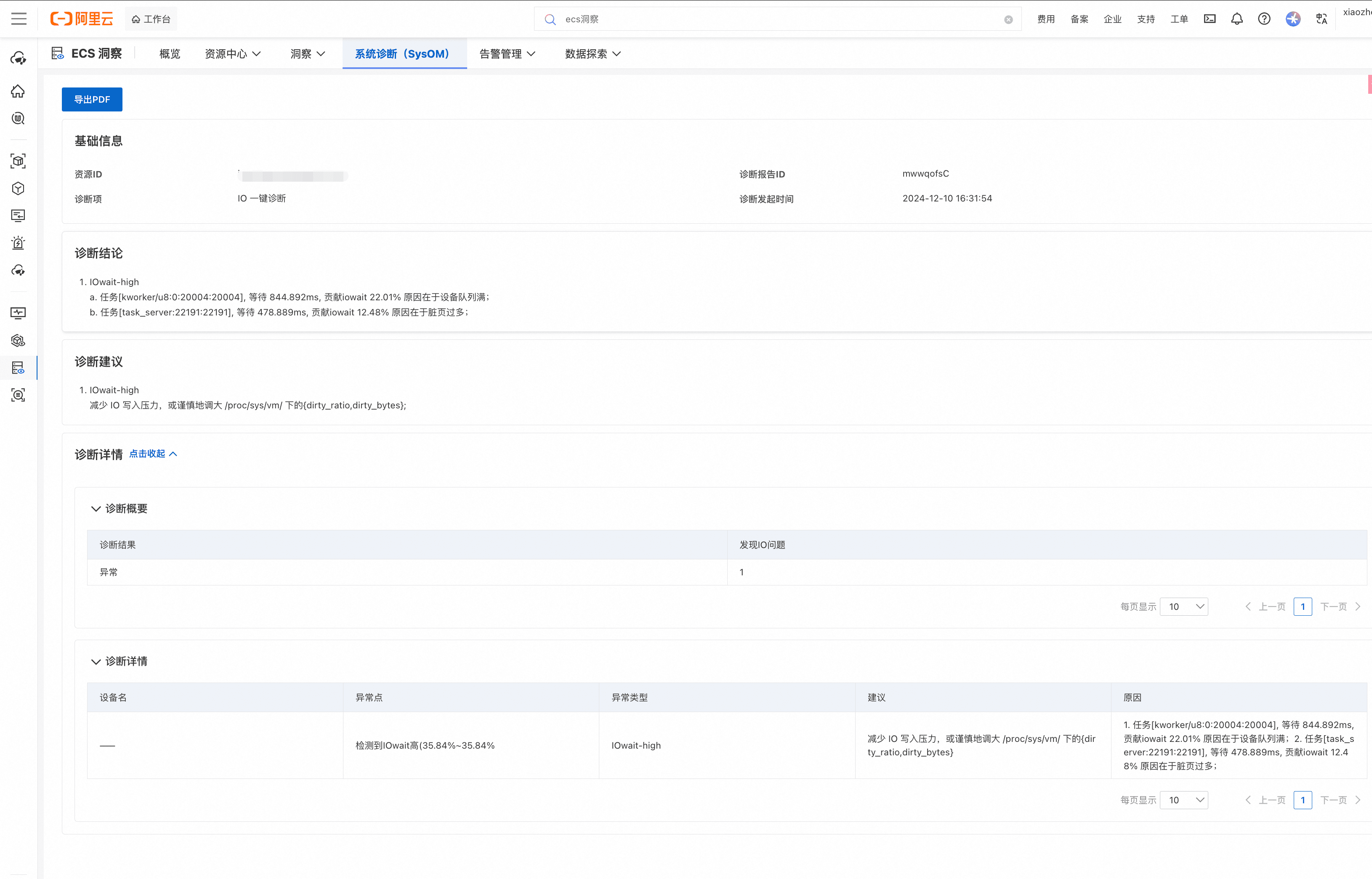 当系统确认存在 IO 异常后,一键诊断模块会自动调用相应的分析工具,抓取关键现场信息并进行自动化处理,帮助用户快速锁定问题。为避免过于频繁的诊断操作影响业务,系统通过以下两个参数对诊断频率进行约束: