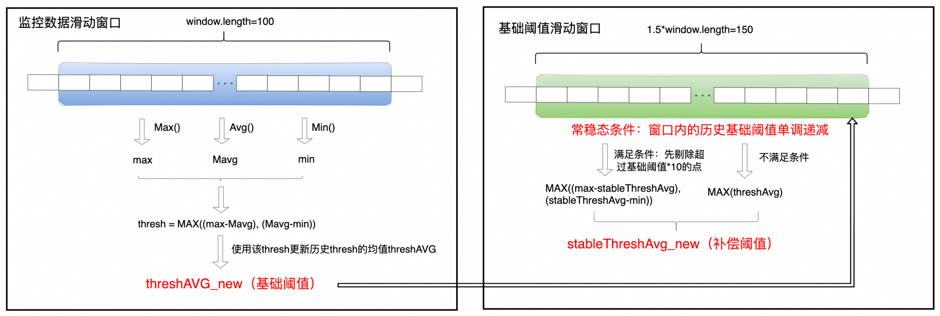 实现策略是:使用一个滑动时间窗口持续观察数据点,在每个窗口中计算所有点相对于窗口平均值的“最大偏离量”,把这个偏离量记为该窗口的“瞬时波动值”;随后对连续多个窗口的“瞬时波动值”求平均,形成动态更新的“基础阈值”。随着新数据不断进入,该阈值也会自适应地调整,始终反映 IO 指标近期的真实波动特征。