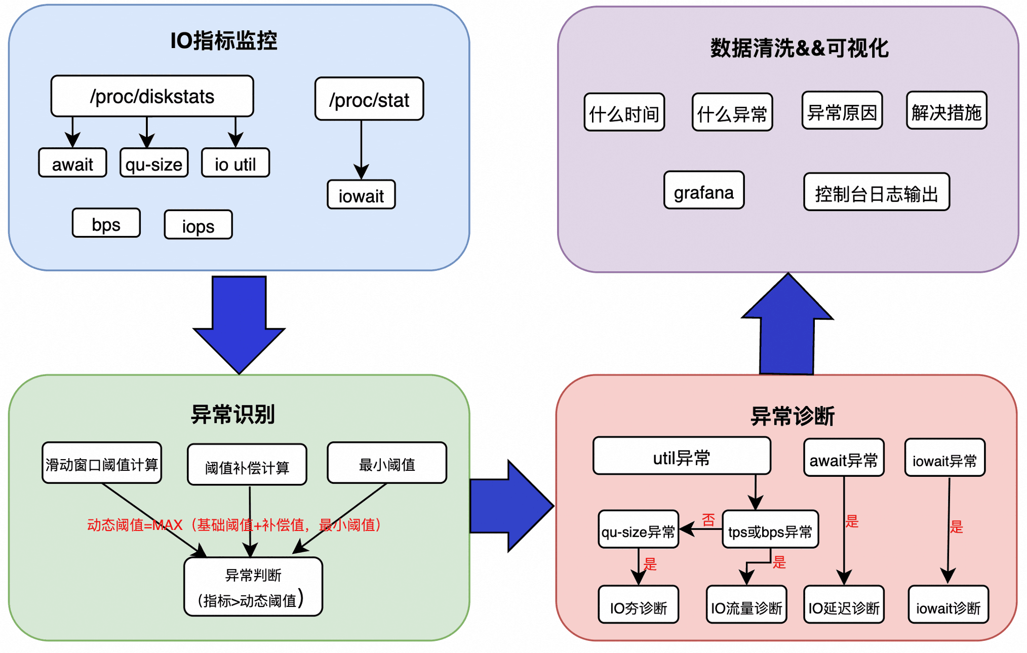 指标采集:定期从系统中抓取关键 IO 指标,如 await、util、tps、iops、qu-size、iowait 等。