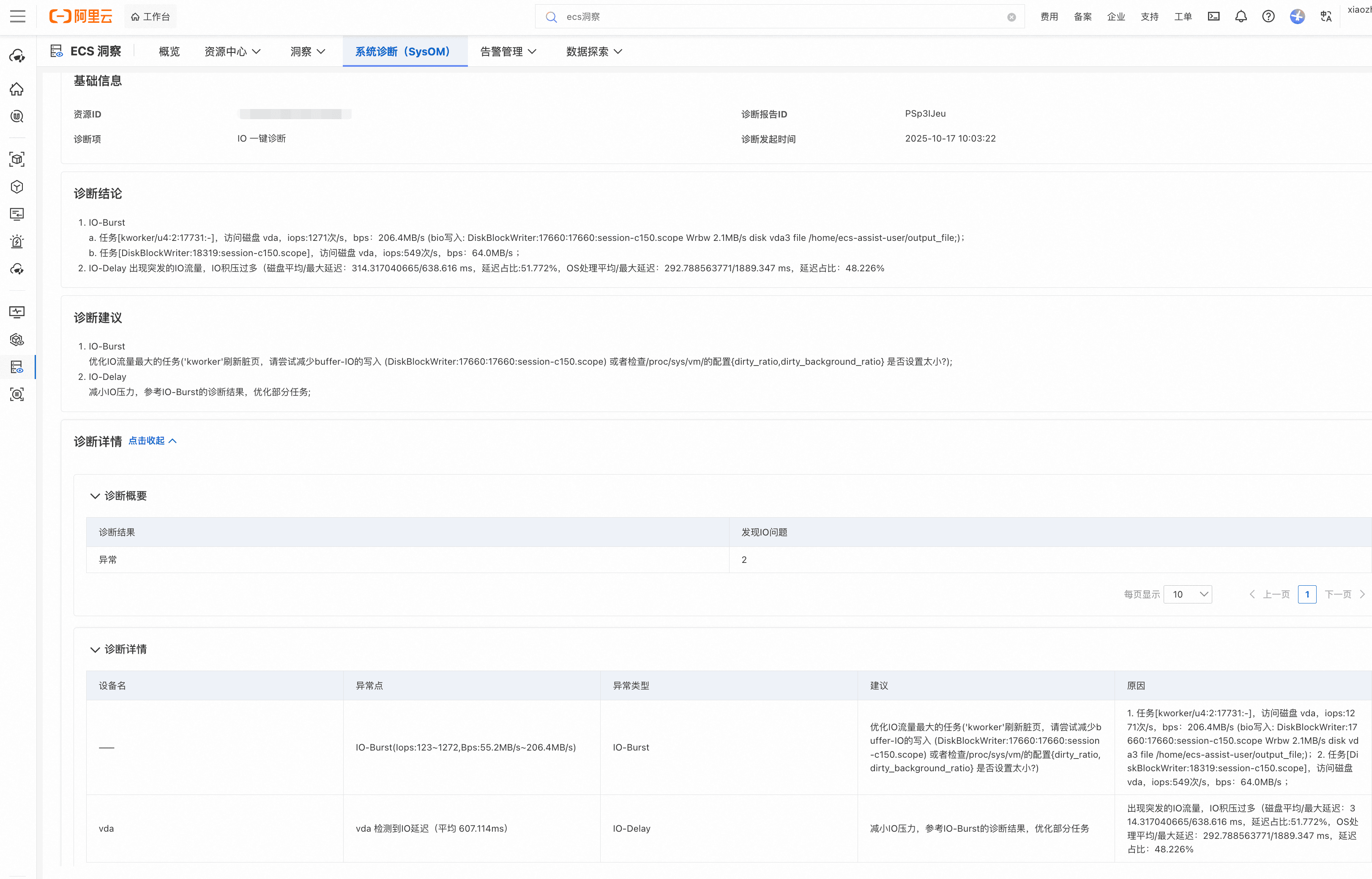 大多数用户对 IO 问题的具体类型缺乏清晰认知,例如往往搞不清当前是 IO 延迟升高、IO 吞吐被打满,还是其它类型的异常,导致很难主动选用对应的排障工具和方法,只能依靠运维专家介入排查,整体诊断效率偏低,人力投入也随之增加。IO 一键诊断聚焦 IO 延时偏高、流量异常、iowait 居高不下等高频场景,自动捕捉 IO 子系统的异常特征,帮助用户快速完成问题类型的判定。