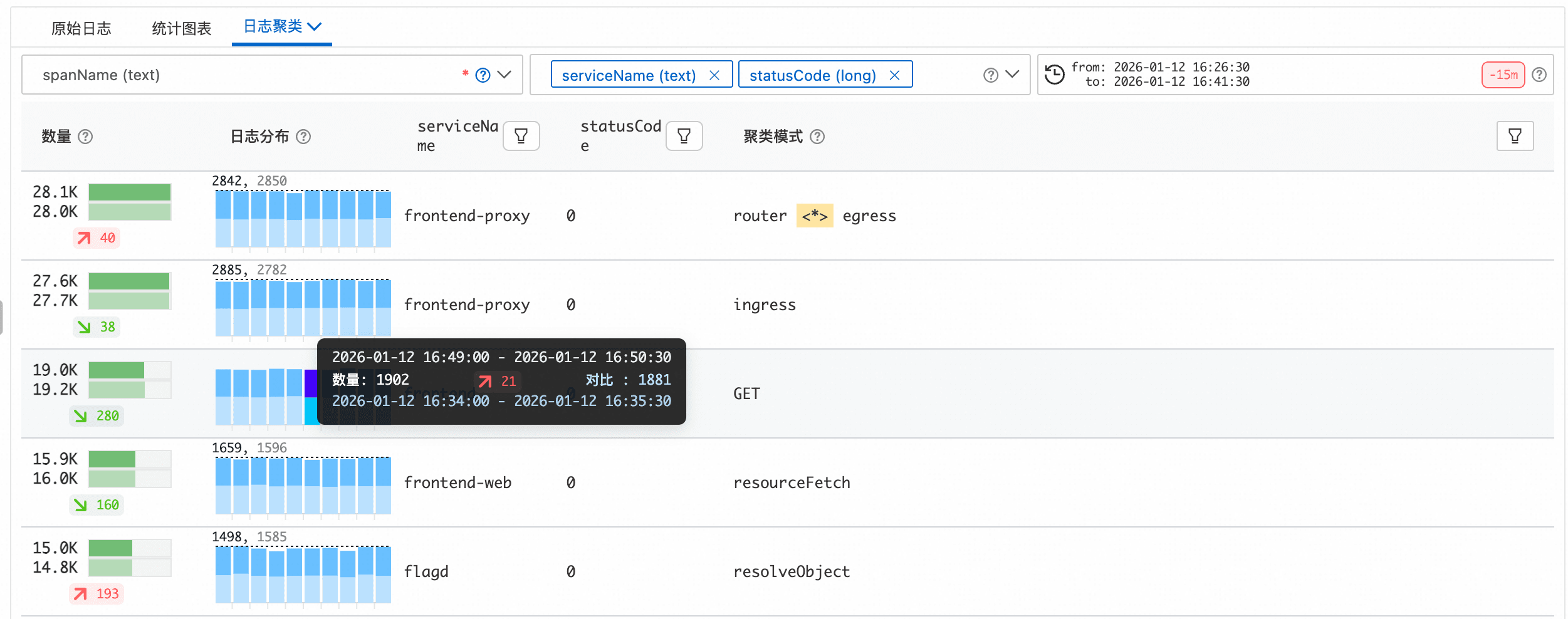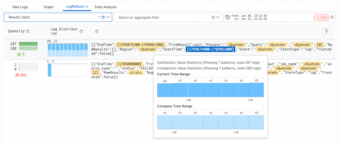 - 洞察发现:自动识别新出现或消失的日志模式,发现人工难以察觉的变化