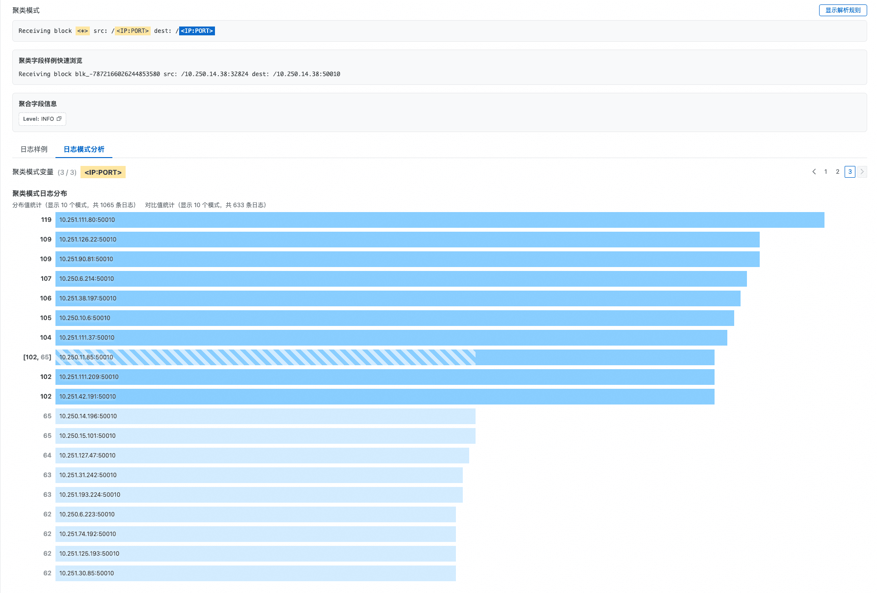 数值型变量:自动识别数字、IP 地址、端口号等数值模式,并支持范围统计。