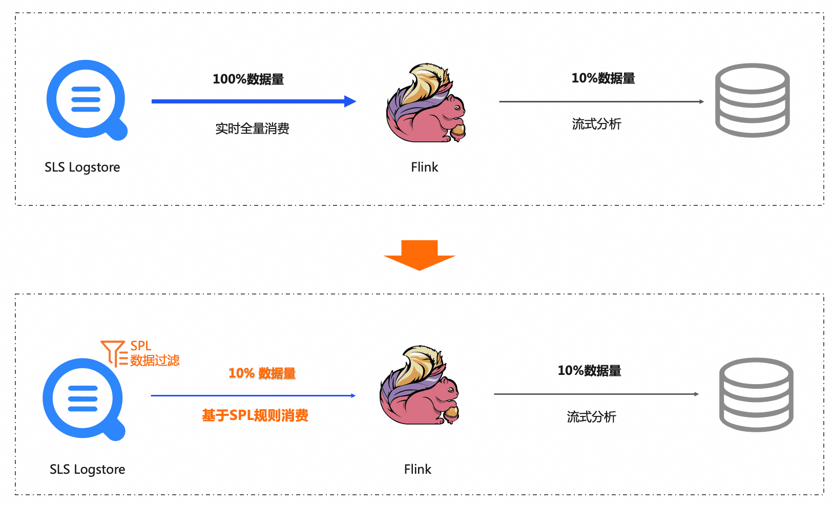 支持中发现:客户的需求是对跨地域的部分数据库实例的日志进行分析,这些日志仅占全量日志的 10%。客户使用 Flink SLS Connector ,将 Logstore 的全量拉取到 Flink 端。也就是说,跨地域访问的场景中,90%公网的流量是不必要的开销,同时这90%的数据到达Flink端也会增加状态存储和计算负担,由于源日志数据仍在快速产生,但是客户所在环境公网带宽有限,加剧了拉取日志的延迟,在分析历史数据时,处理耗时更长。