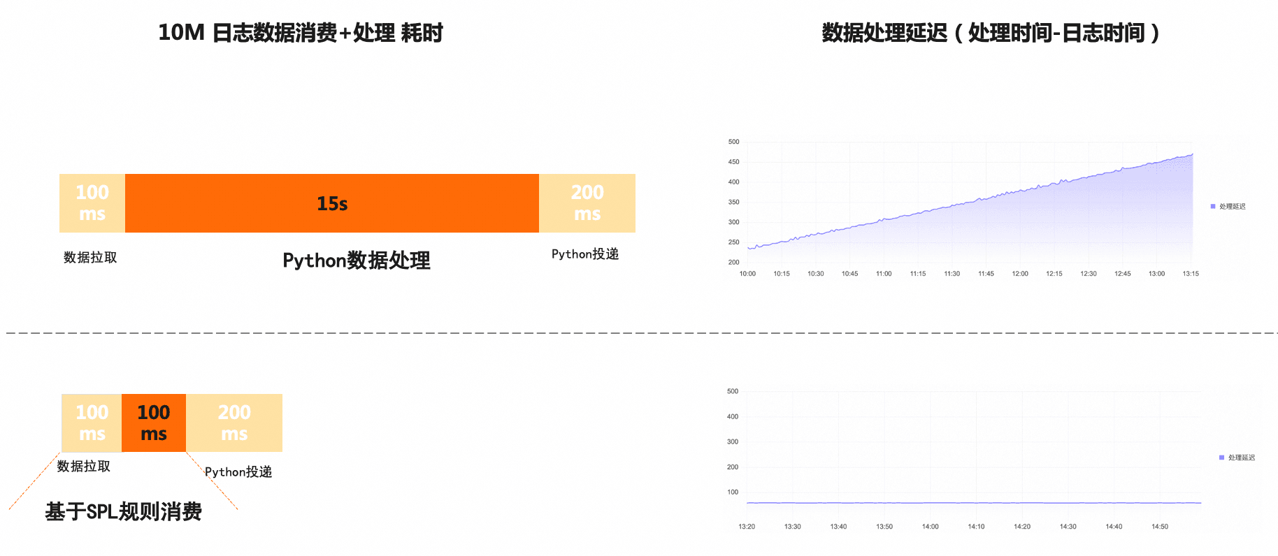通过在 Python 消费程序中配置 SPL,将复杂的数据清洗和预处理任务下推到服务端完成。服务端返回的结果已经是经过清洗和格式化的数据,客户端无需再进行复杂的本地处理。最终,通过在实时消费中引入 SPL,客户的10MB日志函数处理耗时从 15 秒 降低至 不到 100 毫秒,显著提升了处理效率。下图展示了使用基于SPL规则消费代替Python数据清洗逻辑的原理及数据处理延迟对比。