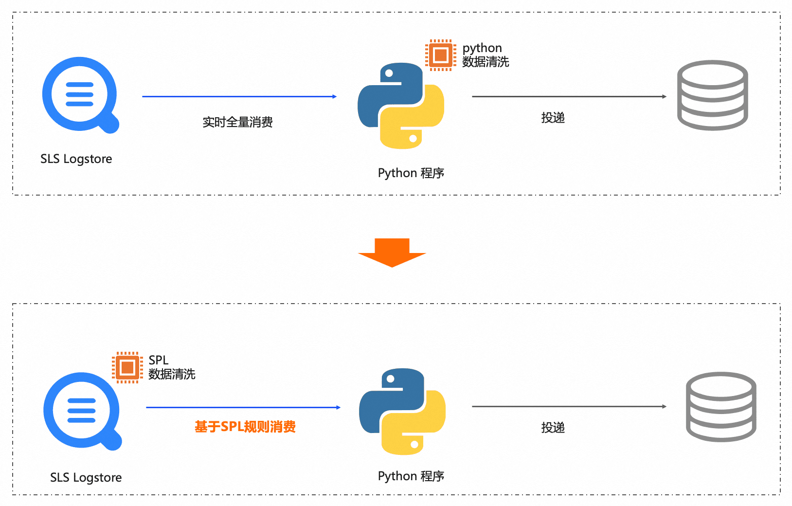 针对这一问题,SLS 推荐客户采用基于 SPL 规则消费 的方式,将数据处理流程做了如下简化,将python代码中的数据清洗逻辑,转换为SPL并配置在消费程序中,删除了大量的低效的数据处理逻辑,替换为简洁高效的SPL(约50行)。