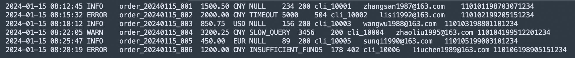 * | parse-csv -delim='\t' content as time,level,order_id,amount,currency,error_code,response_time,status_code,client_id,customer_email,id_card
