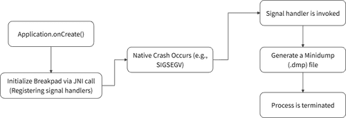 - 崩溃发生: 当 Native 崩溃发生时,信号处理器会捕获它,并将一个 .dmp (minidump) 文件写入指定目录。