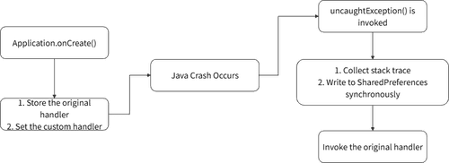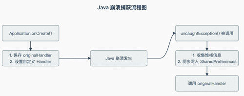 首先需要设置一个全局的未捕获异常处理器来捕获 Java 崩溃,通过实现Thread.setDefaultUncaughtExceptionHandler 的 uncaughtException方法实现一个处理器,我们可以将自己实现的 handler设置为所有线程的默认处理器。这就给了我们在应用彻底崩溃前的最后一刻“力挽狂澜”的机会——记录下导致崩溃的元凶。需要注意我们要保留原始的处理器:originalHandler。