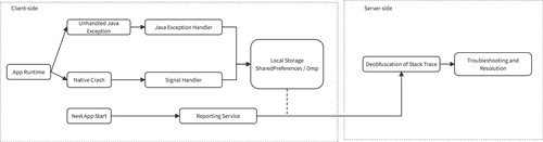 为了全面应对这些挑战,我们设计了一个统一的异常采集方案,遵循“捕获-持久化-上报-解析”的生命周期。无论是 Java 还是 Native 崩溃,客户端的核心任务都是可靠地将现场信息保存到本地。真正的解析和分析工作则交由服务端完成。
