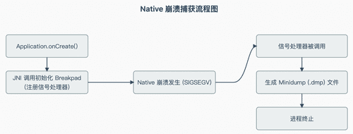 - 初始化: 在 App 启动时,我们初始化 Native 库,并为其提供一个专用的目录来写入崩溃转储文件(crash dump)。