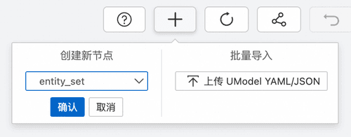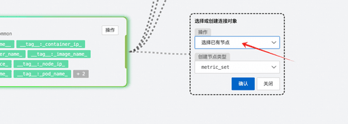 创建节点按钮是快速建模的入口。点击后会弹出一个对话框,若点击创建新节点,则让用户选择要创建的节点类型(entity_set、metric_set、log_set 等)。创建完成后,新节点会自动出现在画布中央,并且会自动聚焦和选中,用户可以立即开始编辑。