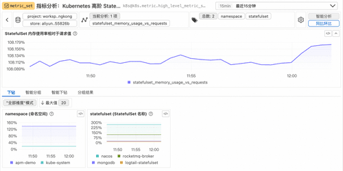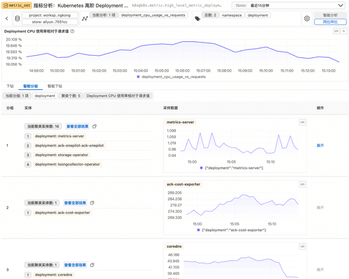 智能分组功能基于时序聚类算法,将所有时间序列按照形态相似度进行聚类。这让用户能够发现数据中的模式或群组,比如高负载、中负载、低负载三类实例,便于进行容量规划或资源优化。