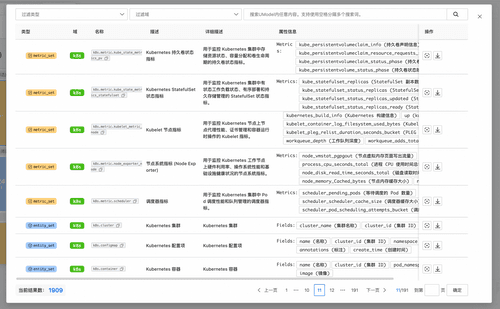 概览页还提供了一个重要的导航功能:UModel 列表视图。点击"查看 UModel 列表"按钮,会进入一个表格视图。这个表格不仅展示所有 UModel 元素的通用信息(名称、域、类型等),还根据不同的元素类型展示专属的关键信息。例如,对于 metric_set,会展示其包含的指标数量;对于 entity_set,会展示实体类型等。表格支持多维度的筛选,包括按类型、按域筛选,还支持全文搜索,用户可以在搜索框中输入关键词(支持中文名、英文名或 ID),系统会在所有字段中搜索匹配的内容。