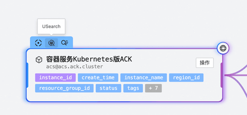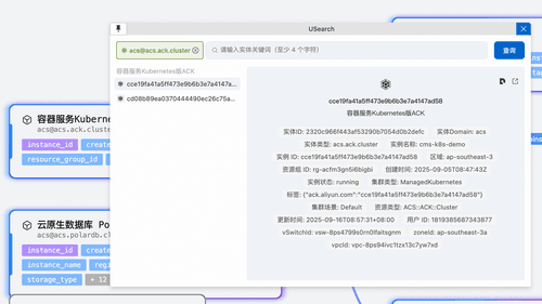 快速查询(Usearch)功能让用户能够直接在画布上查询 entity_set 中包含的实体数据。点击操作菜单中的"快速查询",会打开一个查询面板。在这个面板中,用户可以输入查询条件(基于实体的字段),系统会实时返回匹配的实体列表。查询结果支持进一步筛选和排序,用户可以快速找到感兴趣的实体。