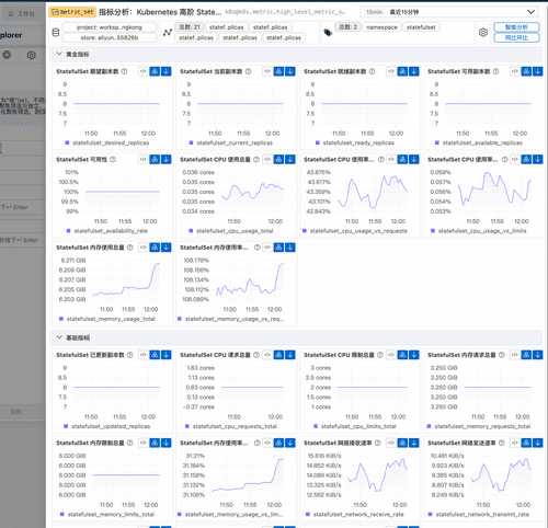 分析面板占据屏幕 90% 的宽度,提供了充足的空间来展示图表和分析结果。面板顶部集成了时间选择器,用户可以选择要分析的时间范围。面板内部包含了指标概览、下钻分析、智能分组、智能下钻等多个分析标签页。
