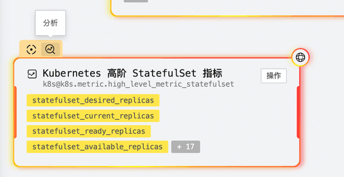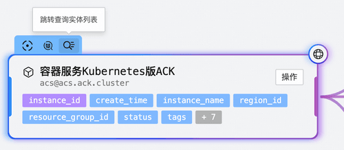 不同类型的节点还有各自的特有操作。例如,entity_set 节点可能有"查询实体列表"、"快速查询"等操作,metric_set 节点有"分析"操作,log_set 节点有"跳转日志查询"操作等。这些操作将建模和分析功能无缝集成,让用户可以在建模的同时直接查看和分析数据。