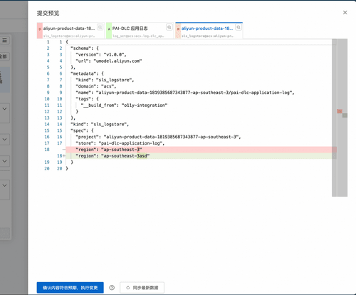 在提交预览界面,用户可以点击每个标签页右上角的定位按钮,将对应的元素在画布上进行聚焦定位,这样可以再次确认修改是否正确。如果担心在编辑过程中,Workspace 中的数据被其他用户修改,可以点击"同步最新数据"按钮,系统会重新获取最新数据并更新 Diff 视图,这样用户就能看到是否有新的冲突。